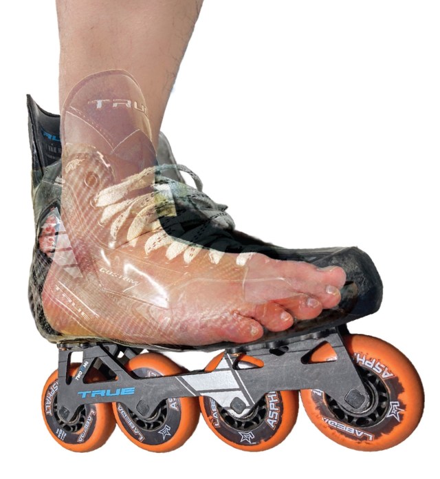 I already had a pair of TRUE hockey skates. They were custom-molded with a monocoque carbon shell, built to 3D models of my feet that my local Pure Hockey store scanned. What I wanted was to put an Endless frame with three 110mm wheels, on these TRUE hockey boots. I just wanted to mount a different frame and different wheels on them, as shown below, in an imaginary image I stitched together for your viewing pleasure.