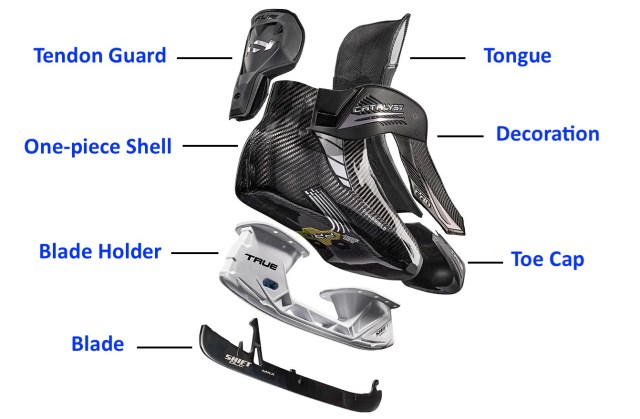For hockey-style skates, the construction of this one-piece shell is similar for both ice hockey and street hockey (with inline wheels). Following is an illustration of this shell with respect to the other parts of the boot.
