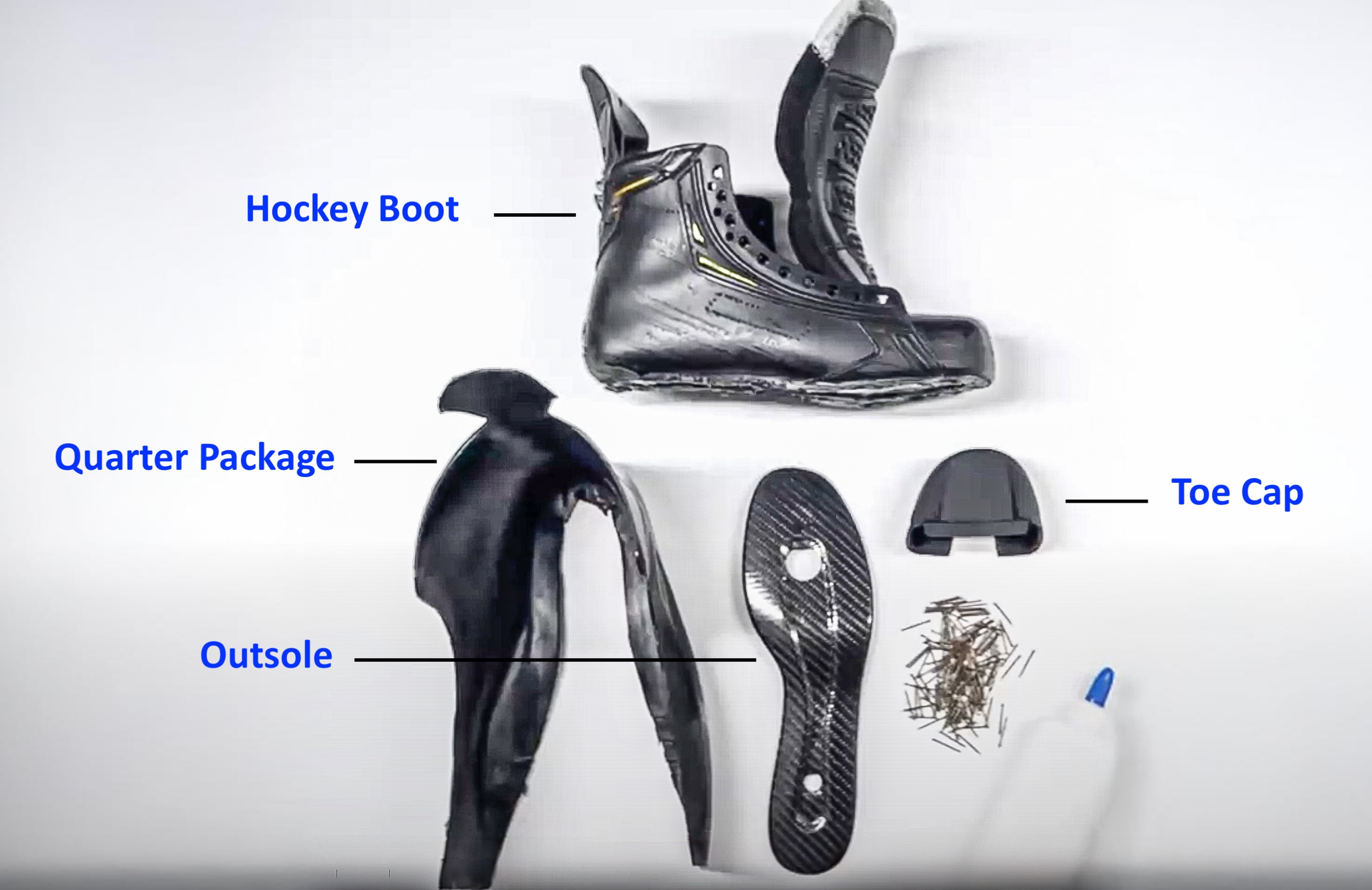 Before the advent of one-piece carbon shells, parts of the traditional quarter package, and the outsole would have been made separately. These were then pinned, nails or otherwise glued together with more parts, into a full hockey boot. Nowadays folks refer to this traditional construction as a two-piece boot, because you build the quarter package and the outsole independently. But of course, the entire boot isn’t made from these two pieces alone. But now you see how the “one-piece” and “two-piece” terminology arose from combining the outsole with parts of a quarter package.