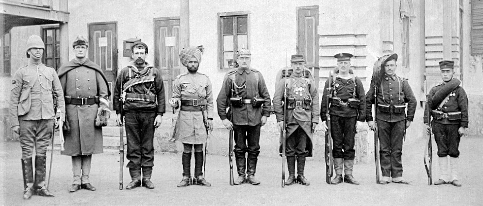 八國聯軍士兵,從左到右:英國、美國、俄國、英屬印度、德國、法國、奧匈帝國、義大利、日本