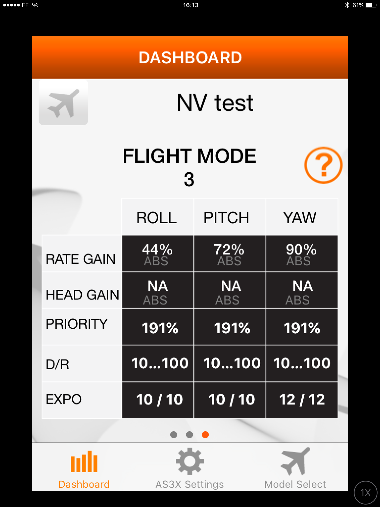 In the Settings page you’ll find that the app sets the “receiver type” for this model to “AR636 (SAFE)”. This is not a receiver type you can normally choose in the app, if you were to create a model file anew, without synching it from the receiver. The app apparently knows that it is dealing with a special, customized AR636. Note how it sets heading gains to N/A? The app knows that SAFE® uses heading hold to implement panic mode.