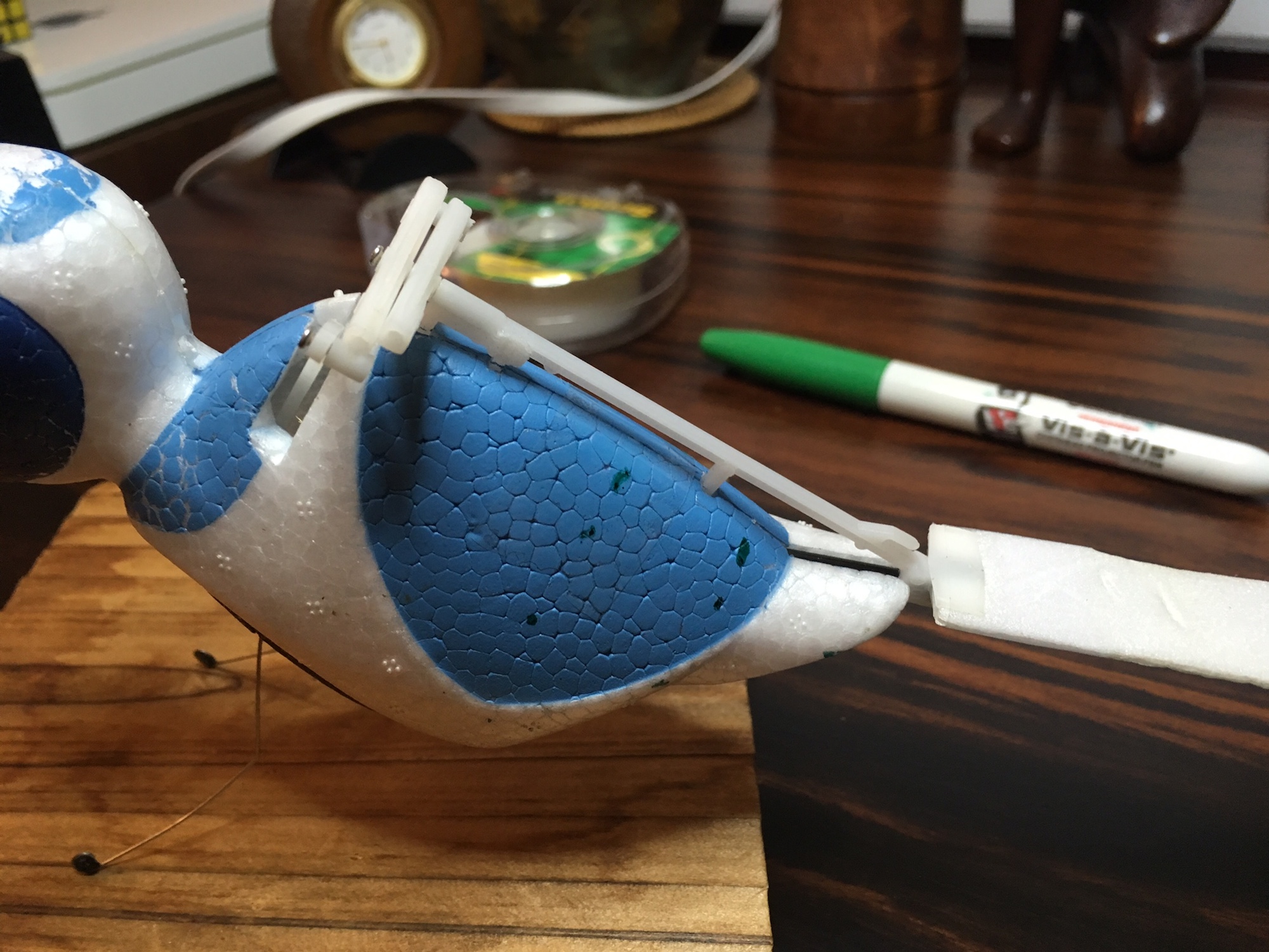 I gave up. It was too heavy. I removed the washer. Then I moved the lipo out and taped it to the side of the bird to try to find the right CG.