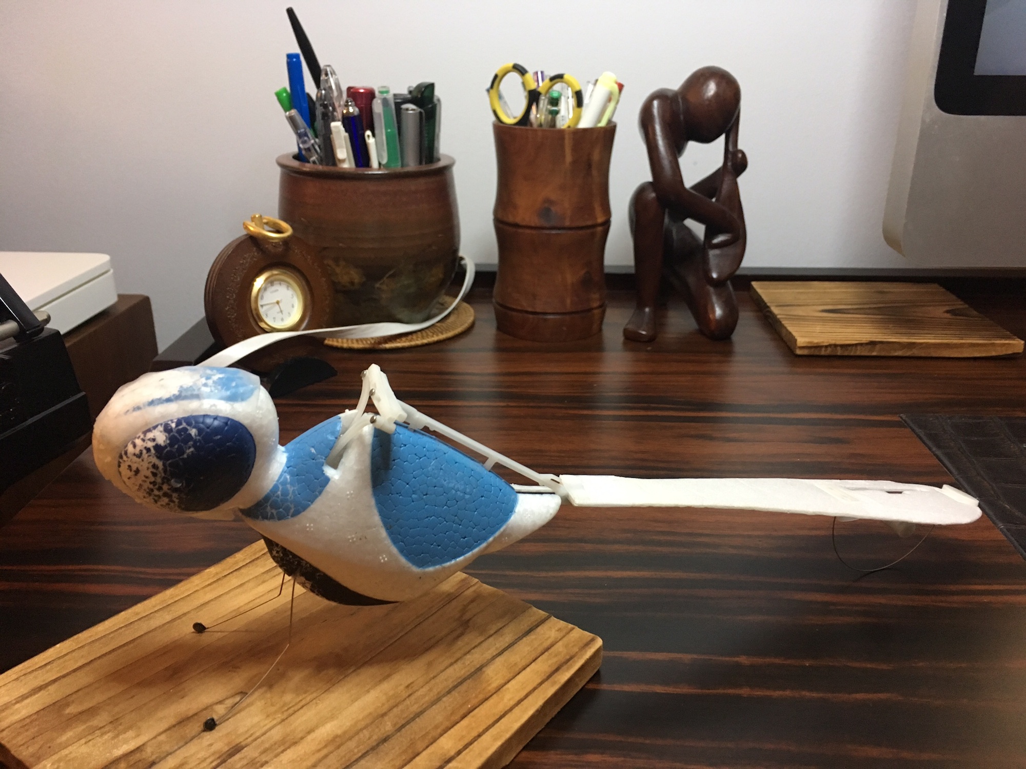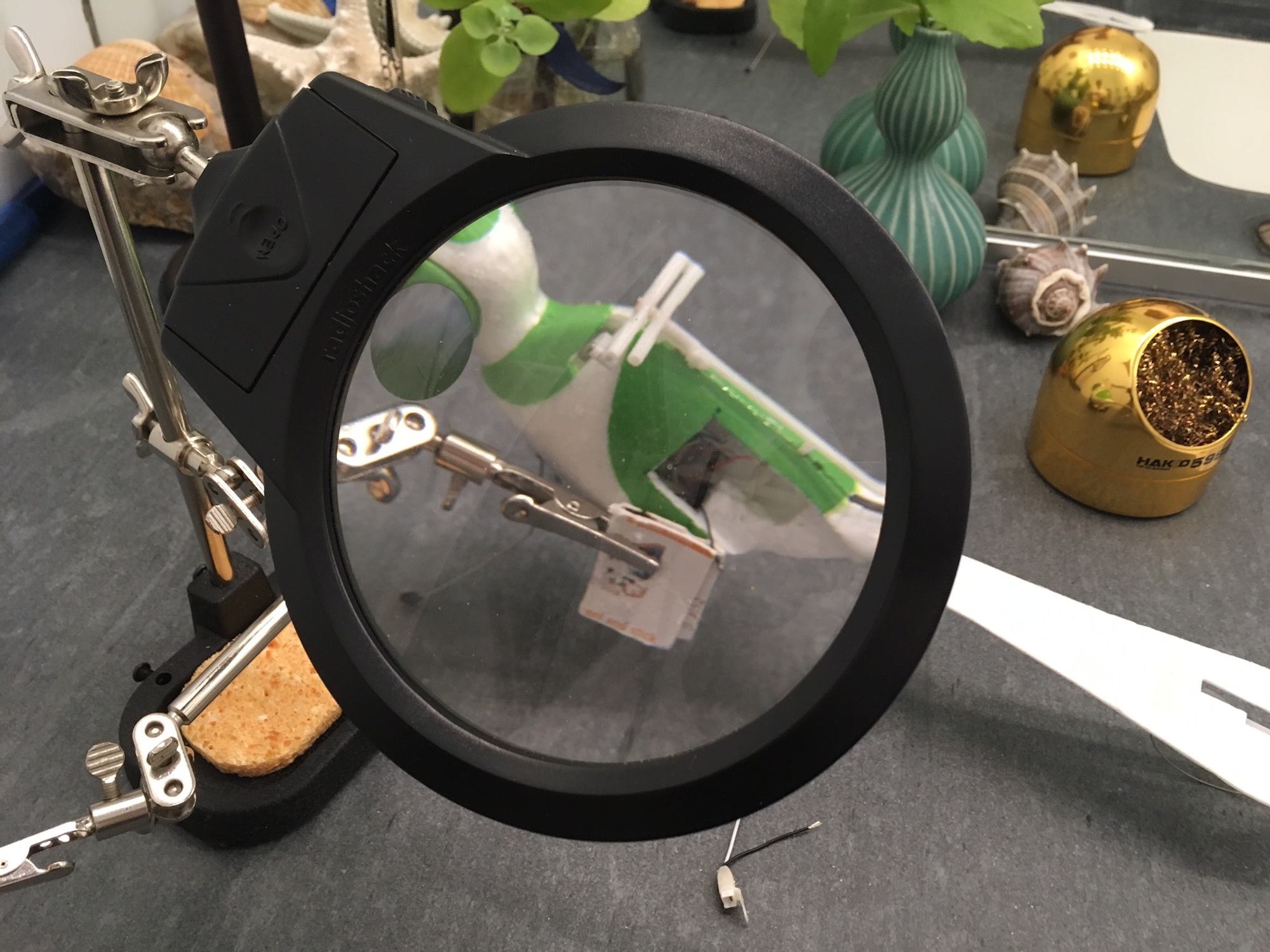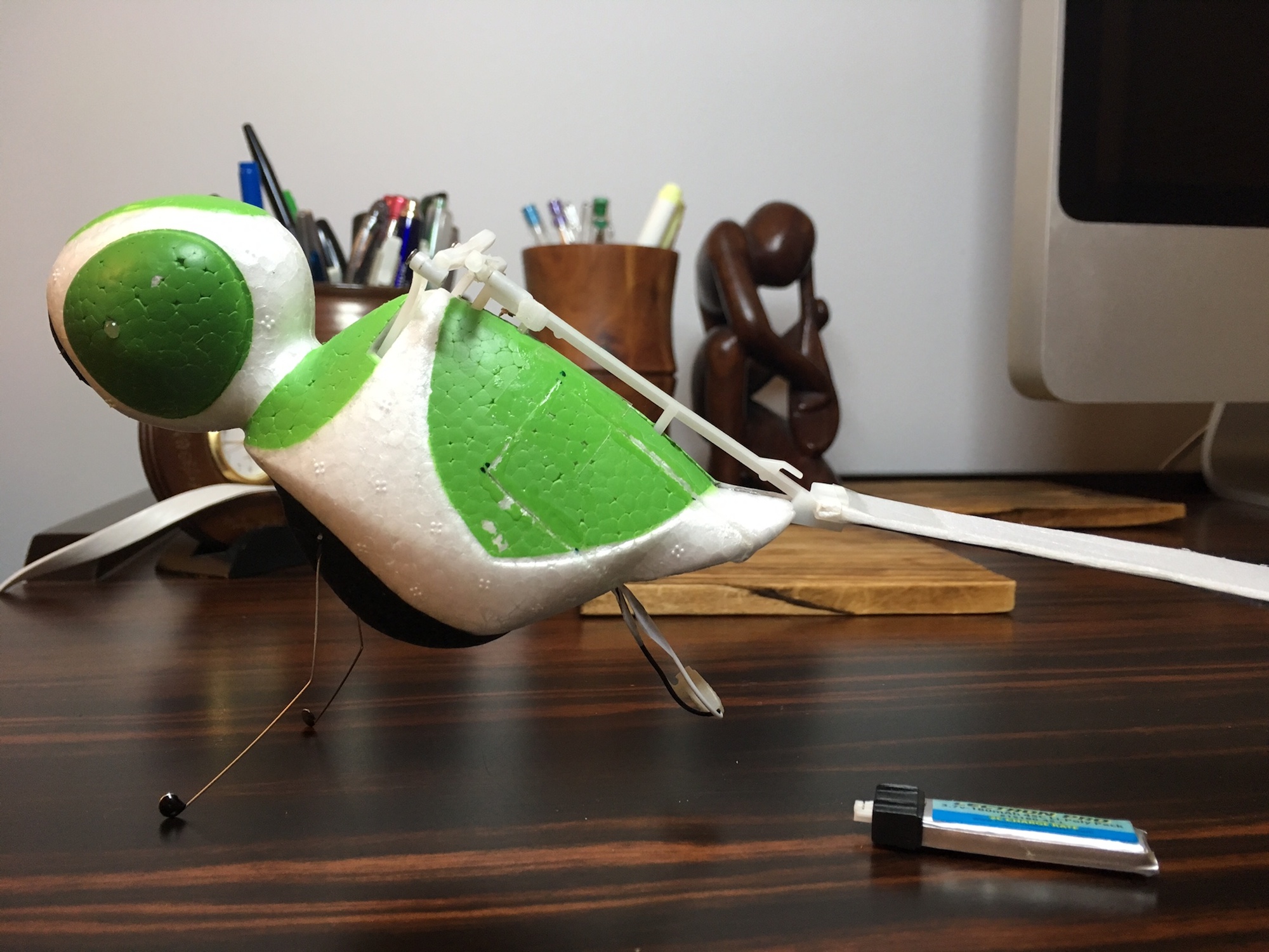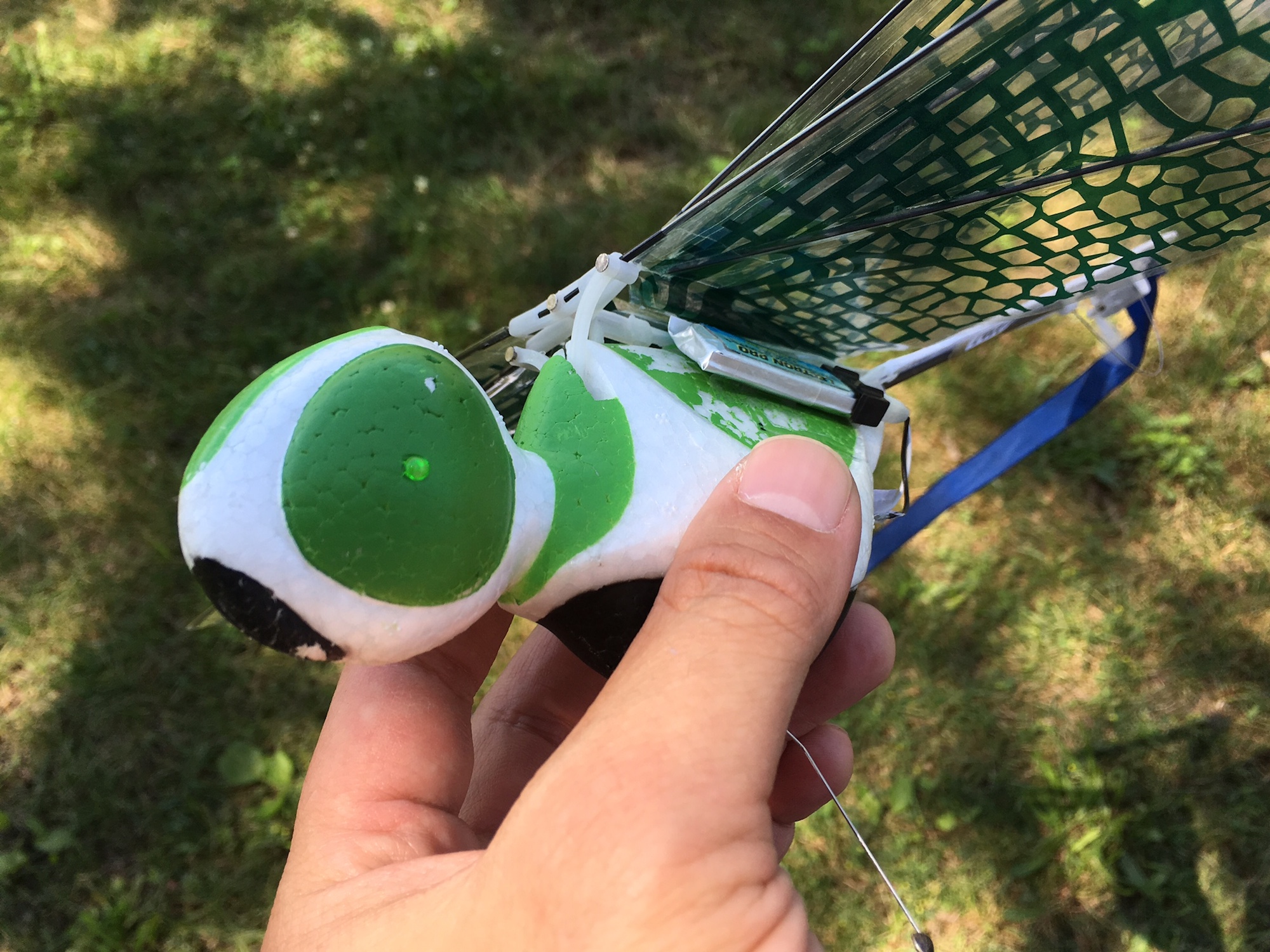 Sadly it did not fly well. There wasn’t much wind this day. But I found that the giant insect was extremely unstable without the tail ribbon. The whole thing appeared to be tail heavy. And I couldn’t insert the lipo further to move the CG. Being a lazy person I just taped a metal washer to its jaw.