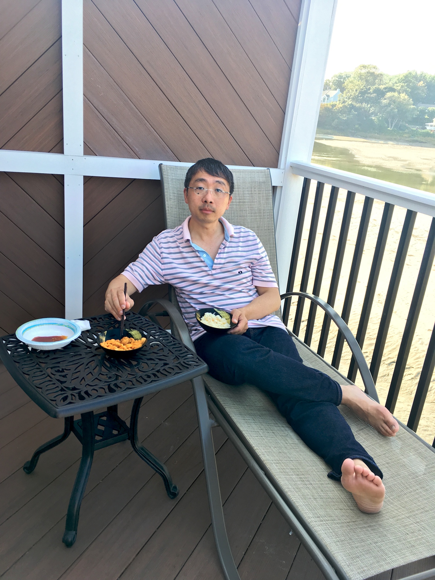 I mentioned that the river bed did not smell. You can have a great meal at the deck. We drove to Portland (Maine) to buy uni (sea urchin) from a processing facility. My wife cooked rice with a rice cooker we brought. Here I was, enjoying my uni don. If you feel disgusted looking at that orange stuff, just think super-soft, presidentially-colored mozzarella.
