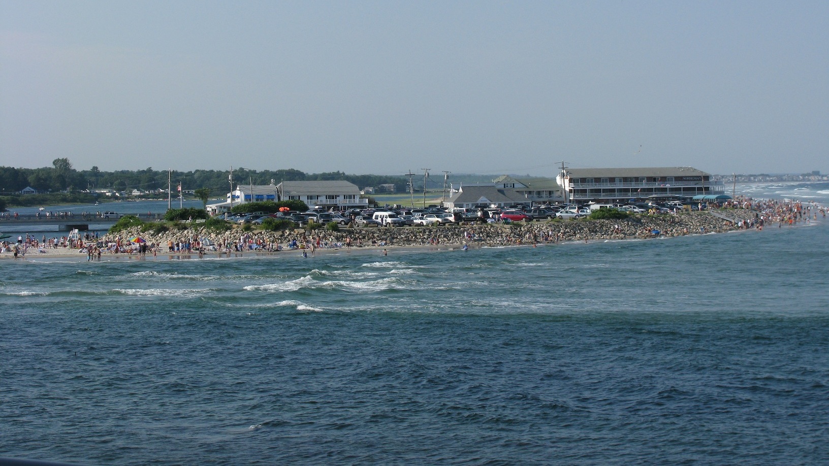 Google Maps gives us some hints as to why the beach works the it way it does. This is a satellite image of the peninsula, with the famous stretch of the beach at the tip of the peninsula. The entire beach spans from south to north for 2.5 miles. I don’t know if peninsula is the right word here, as the Ogunquit River runs on the left side of the peninsula, and empties into the ocean at the tip of the peninsula. The main beach is actually part of the Ogunquit river delta.
