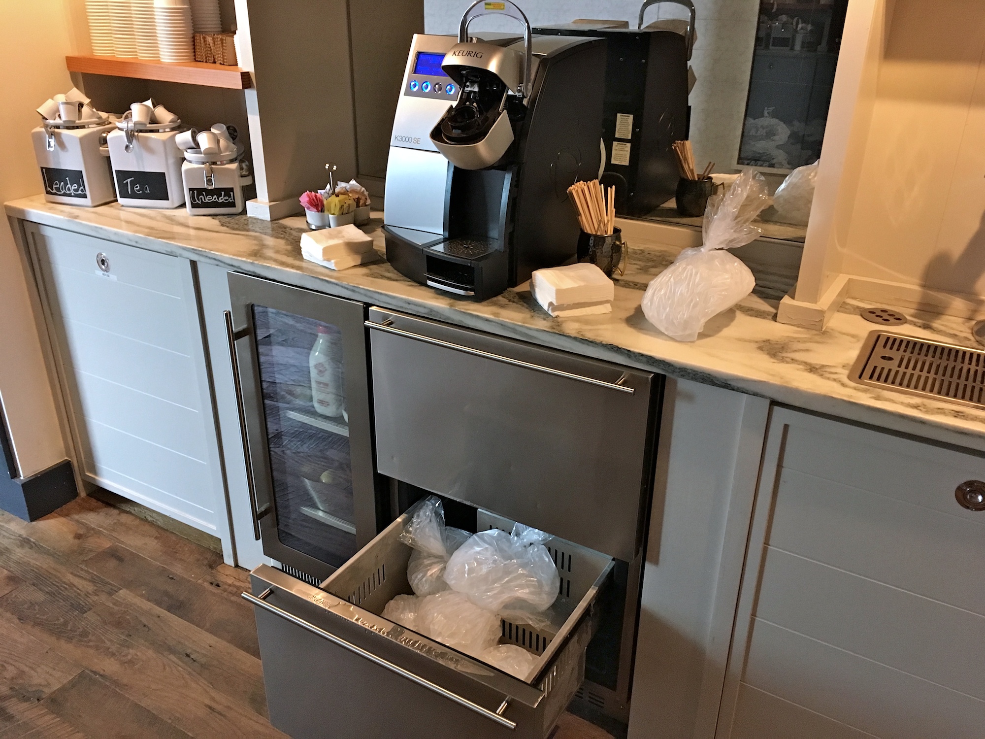 As it turned out, there was a shared pantry on the floor with good coffee and tea. There were paper cups with lids for the convenience of your day trips. Everywhere we turned we saw people strolling around the premises with a cup of coffee in hand, complete with the Cliff House logo. Right quantity of ice cubes were packed in each bag, for you to bring back to your room and dump into your champagne ice bucket.