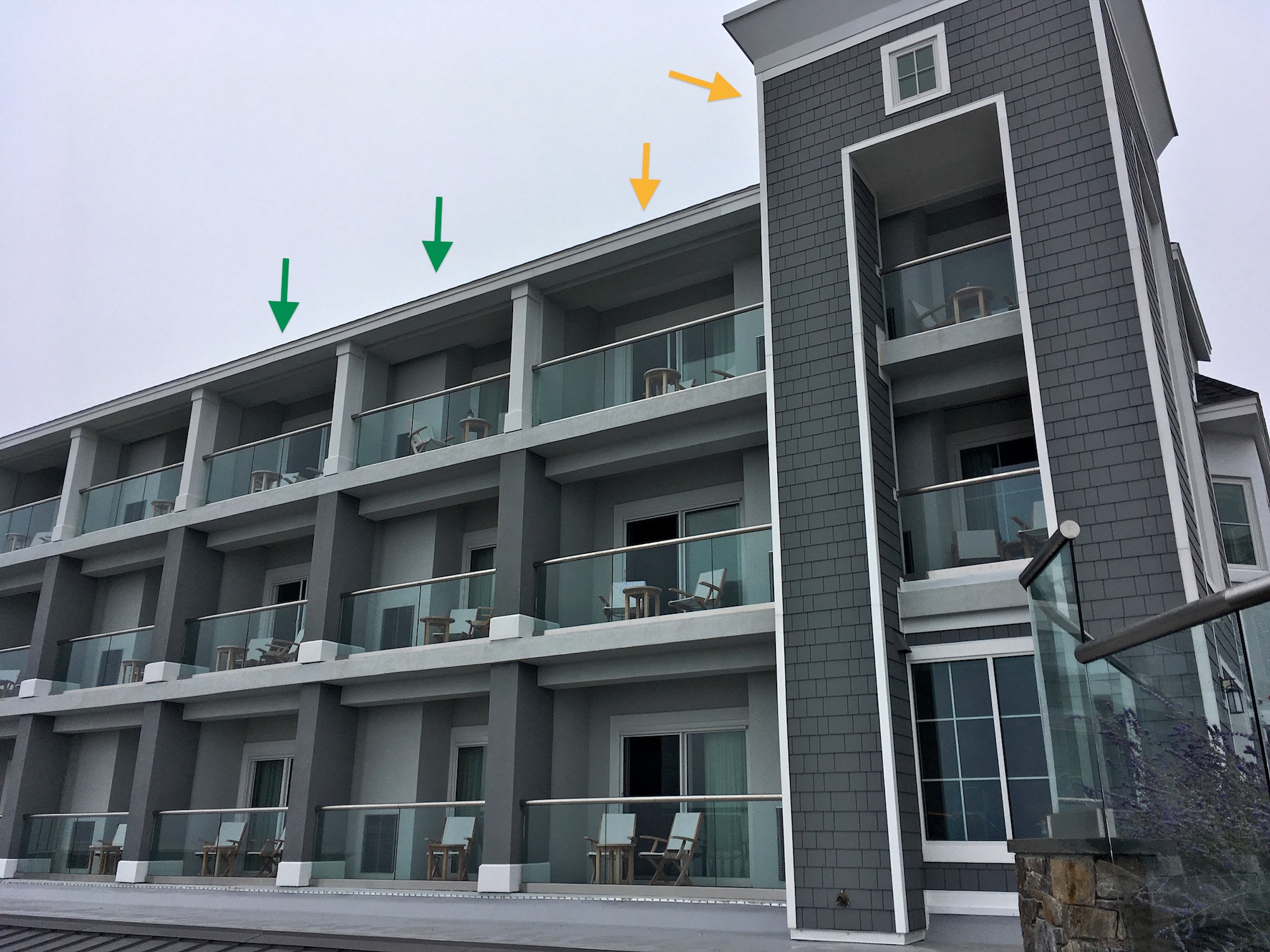 It did not help that the Hotel’s website conflates “terrace” with “balcony”. This page says, “Our 226 inviting accommodations… boast private terraces and incomparable oceanfront and water views”. These private spaces in guest rooms are not terraces. They are balconies. The hotel then proceeds to name most of its outdoor platforms “terraces”, such as Ocean Terrace, Firepit Terrace, Coastal Terrace, etc. Finally, there is Ocean Terrace Rooms to top them all. See the hotel map.