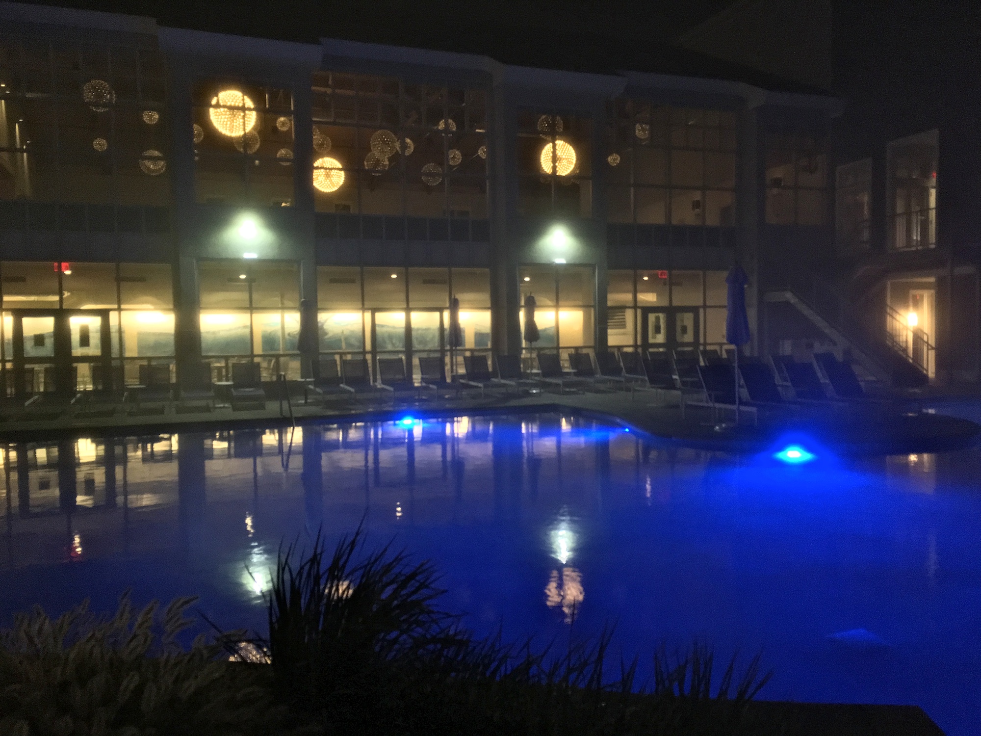 The cliff drops off immediately to the right of the walking path, thus the fence. A fire pit is in view on the left. The outdoor swimming pool is usable and heated. A jacuzzi is located further away. There is an indoor swimming pool as well, but it was closed for renovation during my stay.