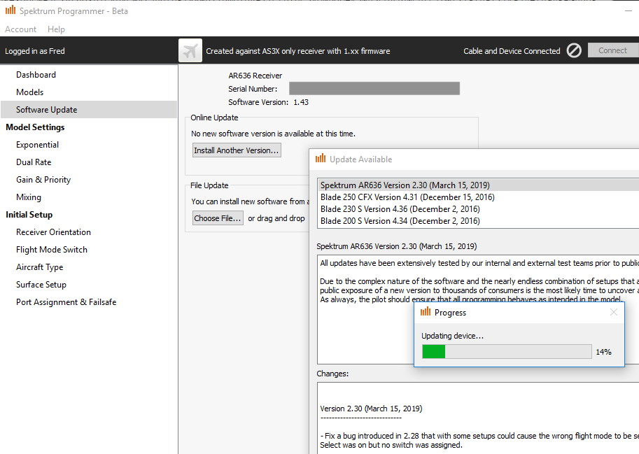 There are two major versions of the firmware: 1.xx and 2.xx. The major version 1.xx denotes the original AS3X without SAFE features. The last version of AS3X firmware is 1.43, released in March 2015. It seems that SAFE features started to be supported when the major version moved to 2.xx. Currently the last version of the the AR636 is 2.27, released in March 2018. If you log onto the Spektrum site and register your receiver online, you can access a user-friendly page showing firmware upgrade choices.