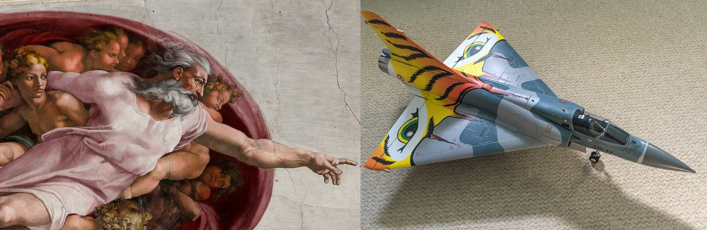 Freewing Mirage 2000 Tiger Meet , a French plane, in front of a French-style foosball table