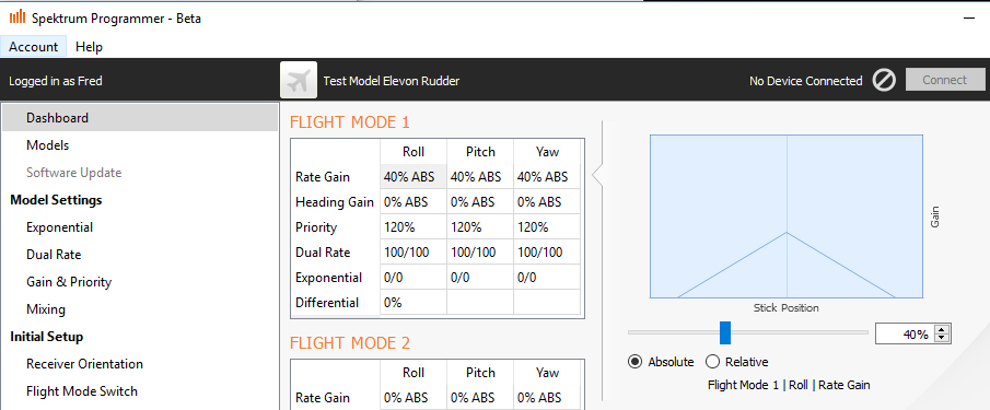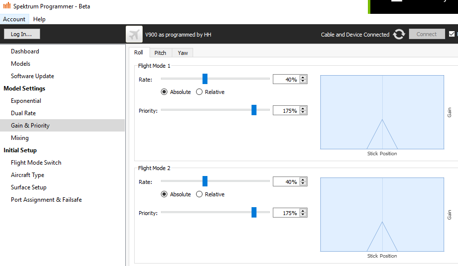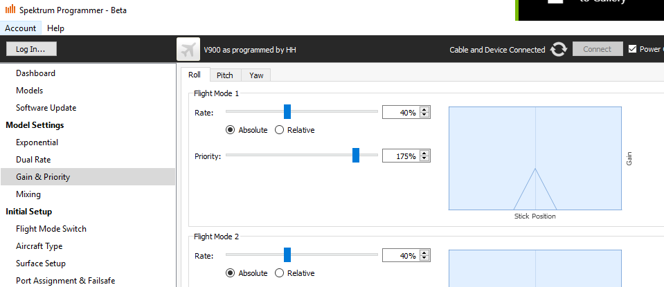 Most people will not feel comfortable with a stick priority of 100%. The plane will appear to be constantly fighting back – during most flights, one rarely moves a stick to max travel. Setting the stick priority above 100% instructs the receiver to treat stick travel below physical max as “large” enough to completely disable rate gain. Many people set the priority to above 130%. I personally prefer even larger priorities such as 160%. This treats 1/3 stick travel as “large” enough.