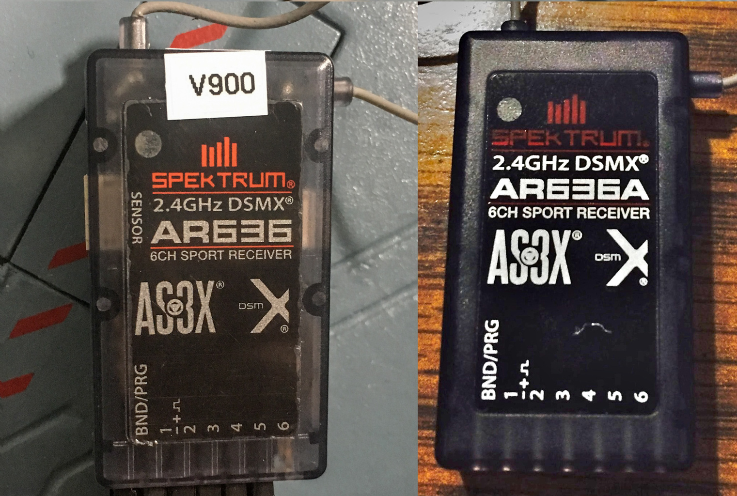 My V900 came with a pre-programmed receiver, marked “AR636A”. Note the -A suffix. As I discussed in the predecessor of this article, BNF models often come with “AR636A”. In general, nowadays, these receivers are identical to open stock AR636 receivers. But exceptions abound. Thus a whole section here discussing the differences.