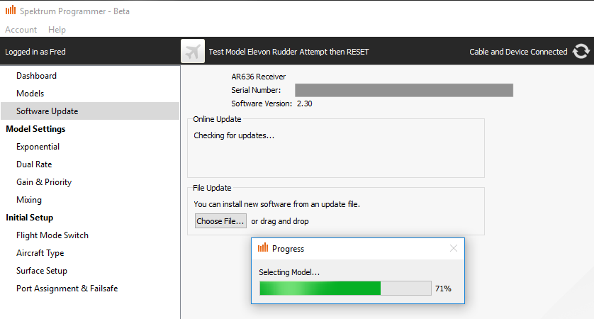 SRM files downloaded from Spektrum also do not have any serial numbers. That allows these models to be synchronized from SPS to any receivers. If you are sharing an SRM file with friends, you should manually remove the serial number from the file. Otherwise they will have trouble loading this model onto their own receivers. Lastly, if you are posting your SRM file to rcgroups.com, you should also remove the serial number, even if you just want people to look over your configuration, to help you debug issues. You don’t want someone else to get hold of your serial number, and register your receiver on the Spektrum website under their own account.