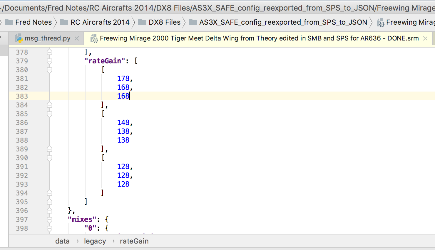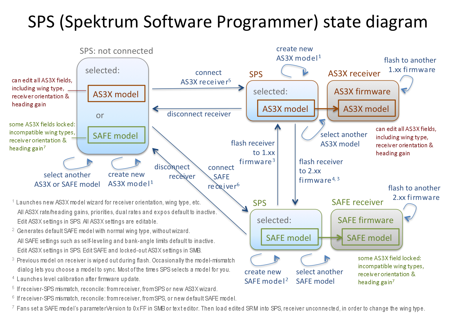 For anyone attempting to push AR636 reprogrammability beyond that allowed by Spektrum, a clear understanding of both AS3X® and SAFE® is essential. You will need to understand clearly what the Spektrum Programmer Software (SPS) can do (i.e. AS3X), and more importantly cannot do (i.e. SAFE). The SAFE Model Builder (SMB) written by Flightengr makes up for what is missing (i.e. SAFE). You will need to shuffle model files among SPS, SMB, your file system and the receiver. When neither apps can make changes you need, you will have to edit raw model files yourself in a text editor.