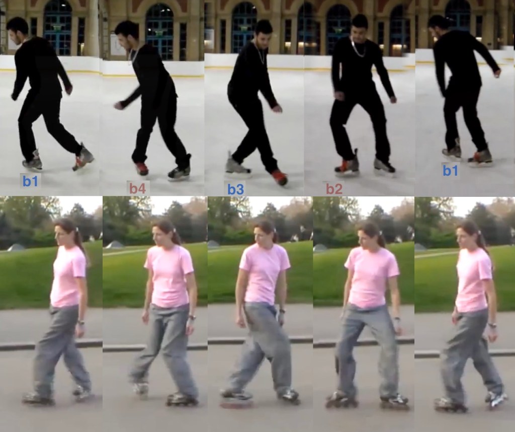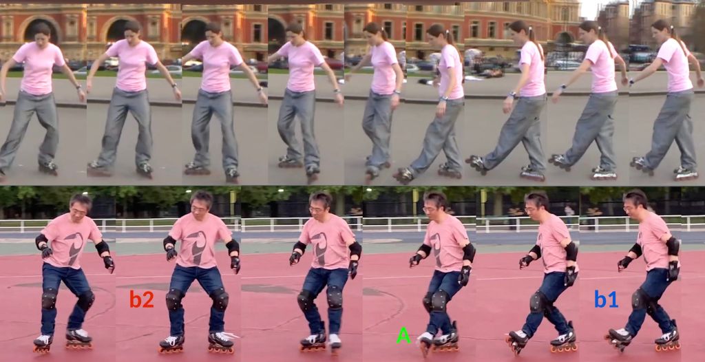 More importantly, Naomi almost never have both skates flush on pavement, at any given moment in this entire Grapevine sequence. One skate is always pivoting on toes, or on the heel. As Naomi explains in her video, Between b1 and b2, Naomi’s right foot pivots on her heel prominently. Between b2 and b3, her left foot pivots on the heel as well. Between b3 and b4, both her foot pivot on toes prominently. In contrast, Jordan only does a visible toe-pivot on his left foot, after balance moment b4.