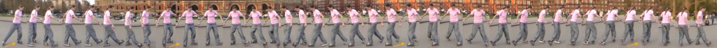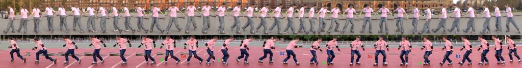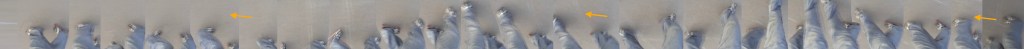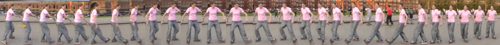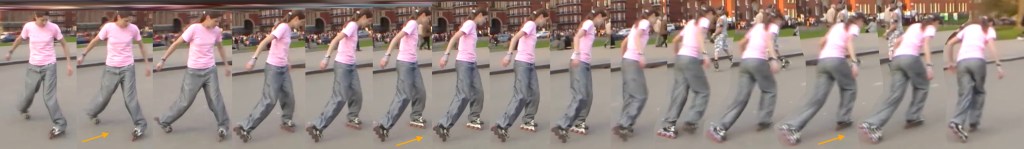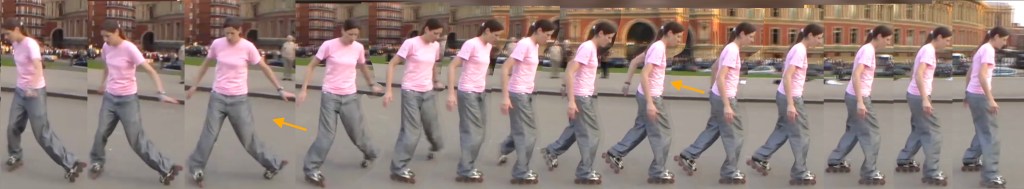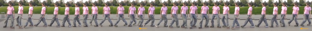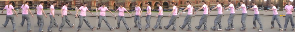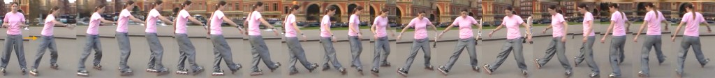 Compare the tracing diagram above to the stop motion sequence from earlier, reproduced below. Appreciate the symmetry of the two feet with respect to paths they trace on the ground.