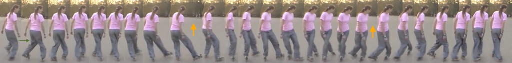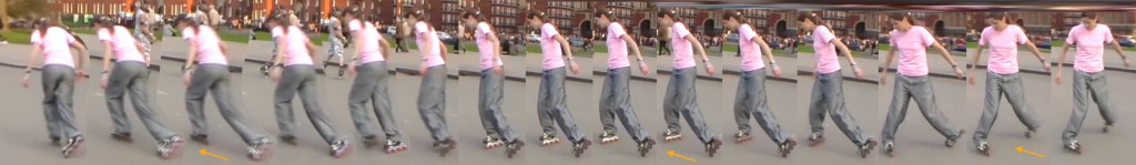 Let’s look at Naomi’s Skill 5 video again. I said earlier that she explicitly slowed down all four pivots for a clear demonstration. Now that we’ve discussed difficulties in injecting energy into the move, we can much better appreciate what she did here. Because she deliberately slowed down her moves 5 times her regular pace, she couldn’t coast on just her initial momentum. At every pivot, in this slow motion demonstration, she had to grab and pull on the pavement with one skate, in order to make the other skate glide. Thus, one way to learn to inject energy is to slow down moves. This will force the body to learn to grab and pull on the pavement.
