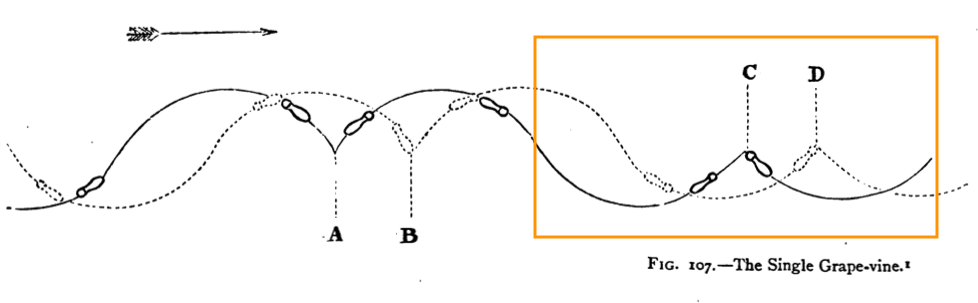All four “pivots” Naomi stresses are clearly shown in this diagram. The orientation of both feet change constantly throughout the Grapevine move. As a foot turns its orientation, the body continues to move in a constant direction. At some point, the foot flips the direction of its travel, even as it continues to turn. For instance, at label A, the right heel continues to turn clockwise, but it now reverses the direction of its travel, going from forward to backward. There are four such direction reversals in Grapevine. They are marked A, B, C and D. They create four sharp corners in the two otherwise smooth curves traced by the two feet.