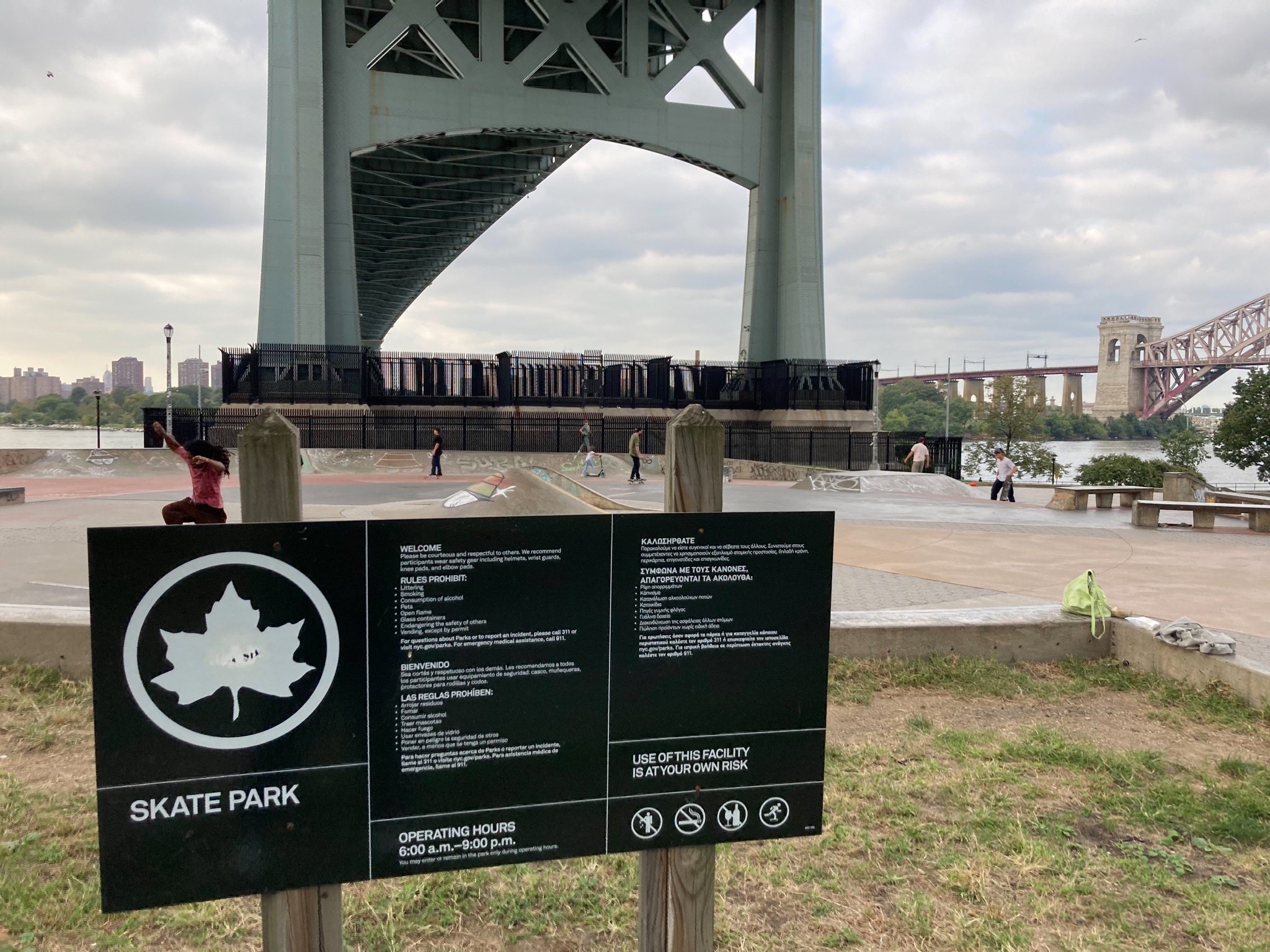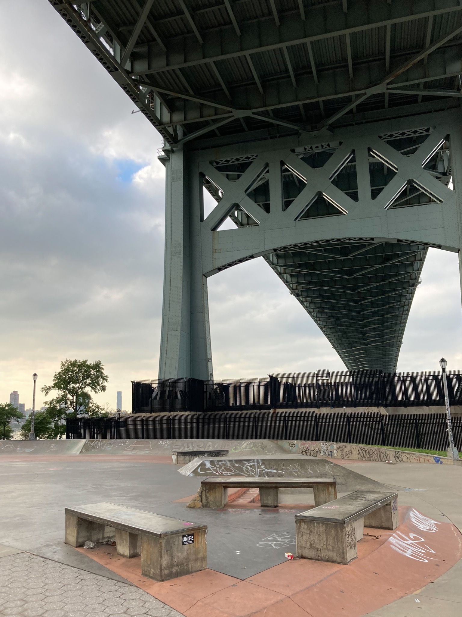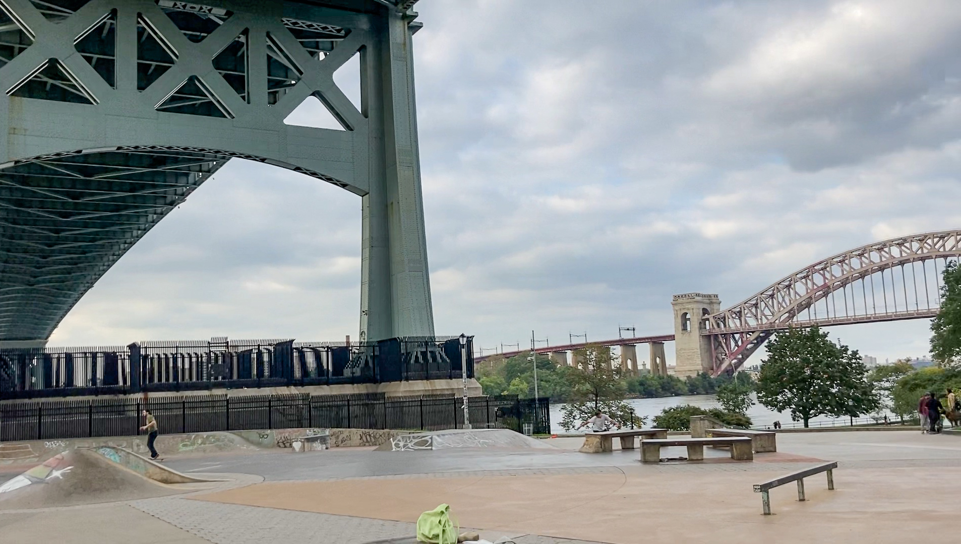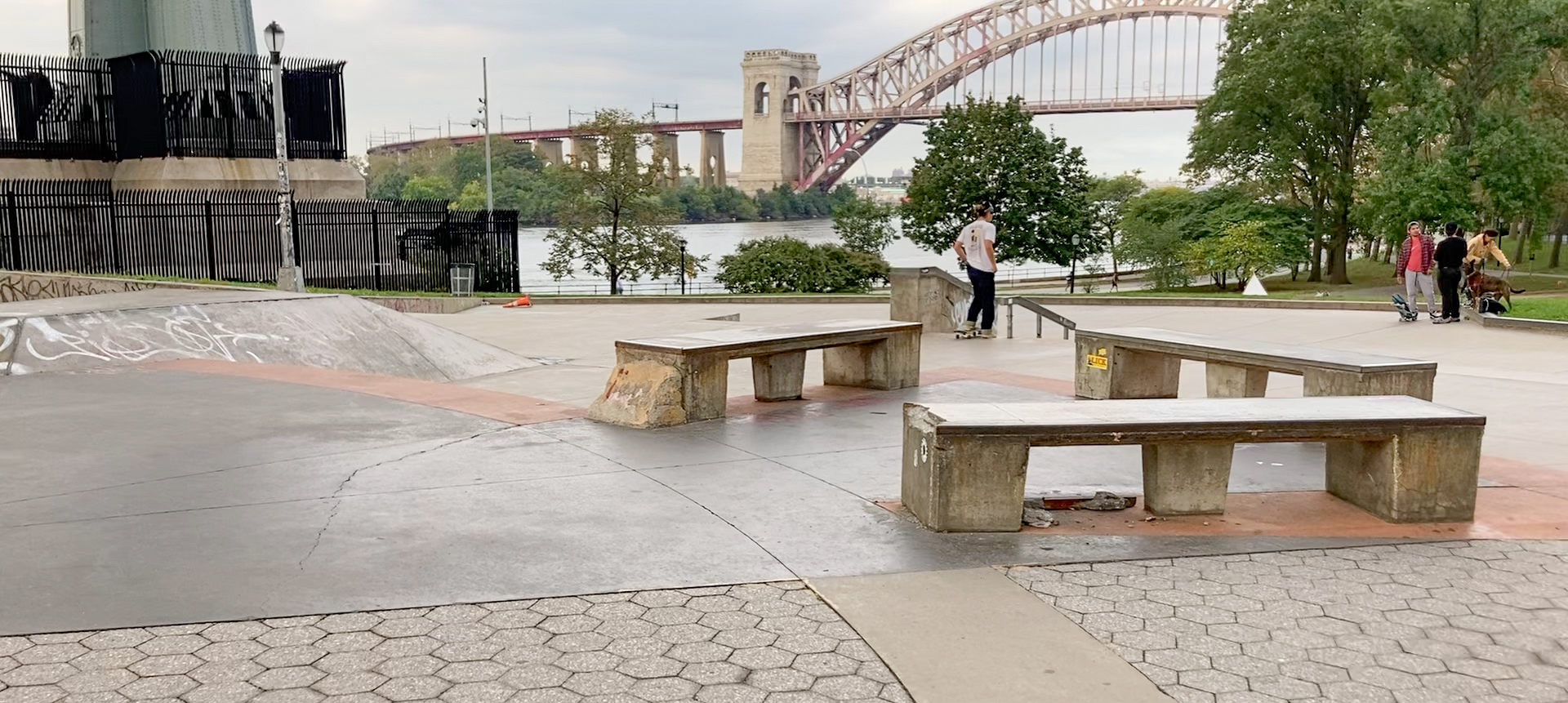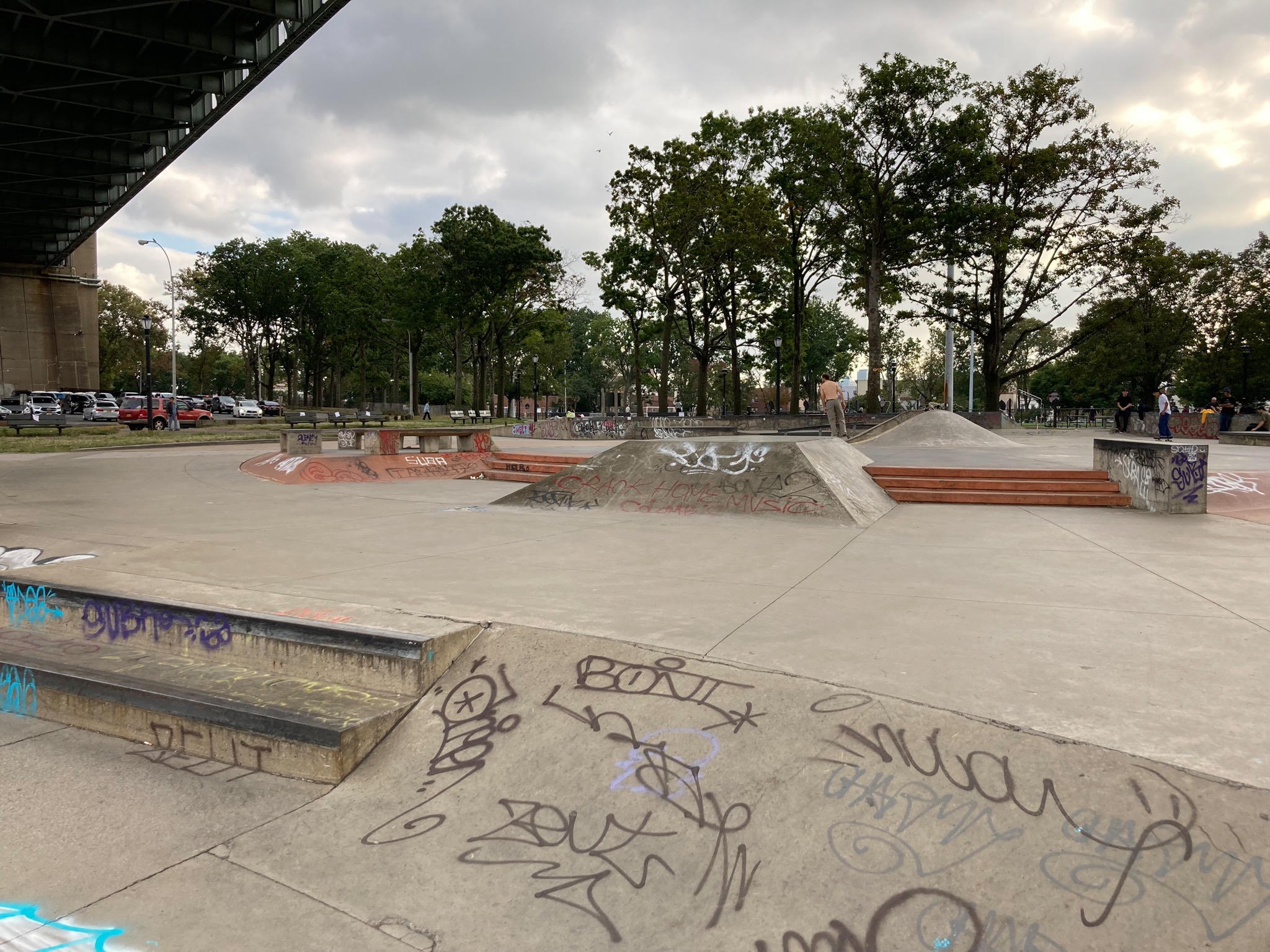 Astoria Skatepark is located right under the Triborough Bridge, in Queens. It is a 21,500-square-foot installation with transitions on three levels of surfaces including concrete and bricks. For inline skaters, there are also paved trails around the Astoria Park, and an entire shoreline street closed to motor vehicles for bikes and skaters. This is a part of my Public Skateparks on Long Island series.