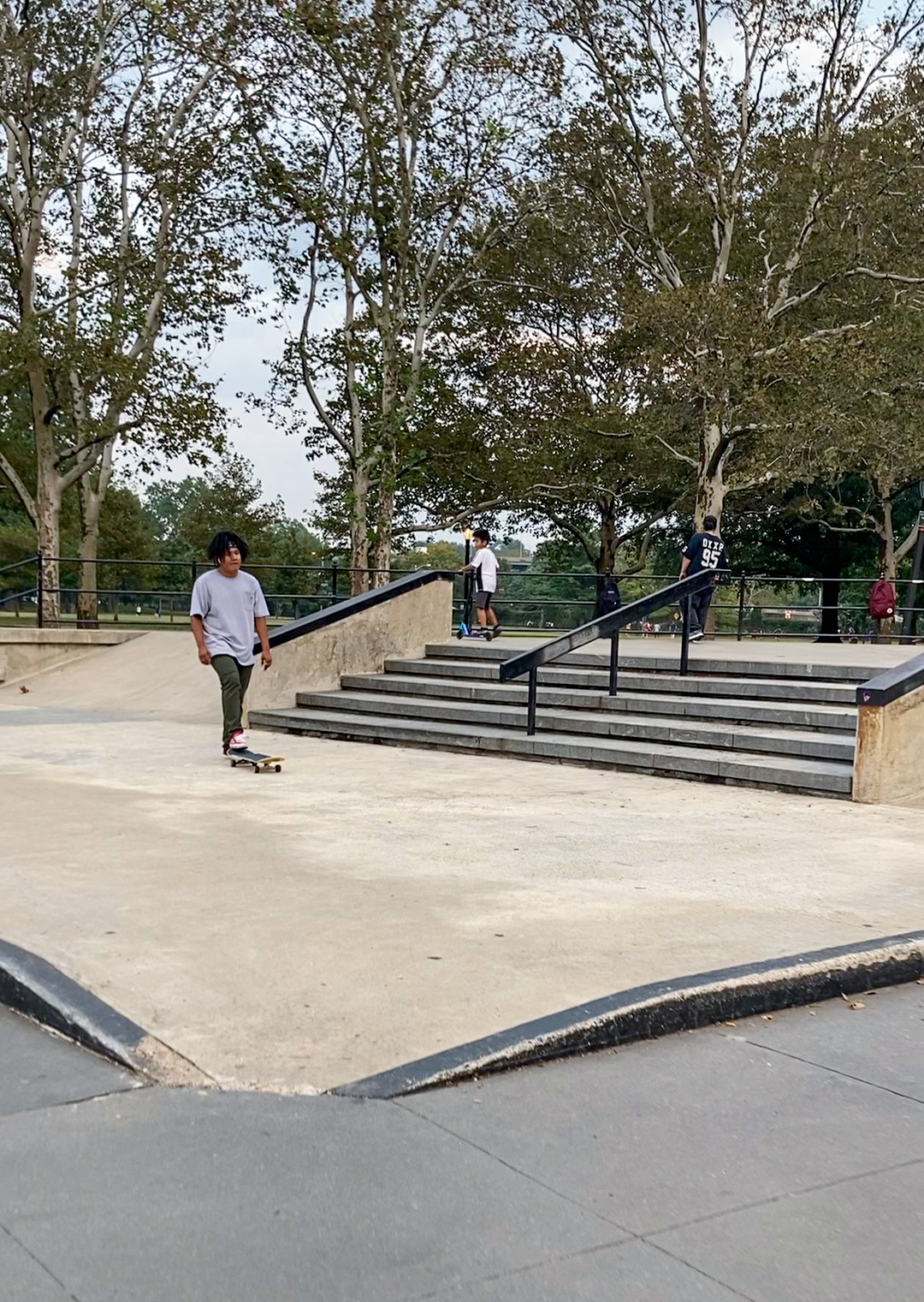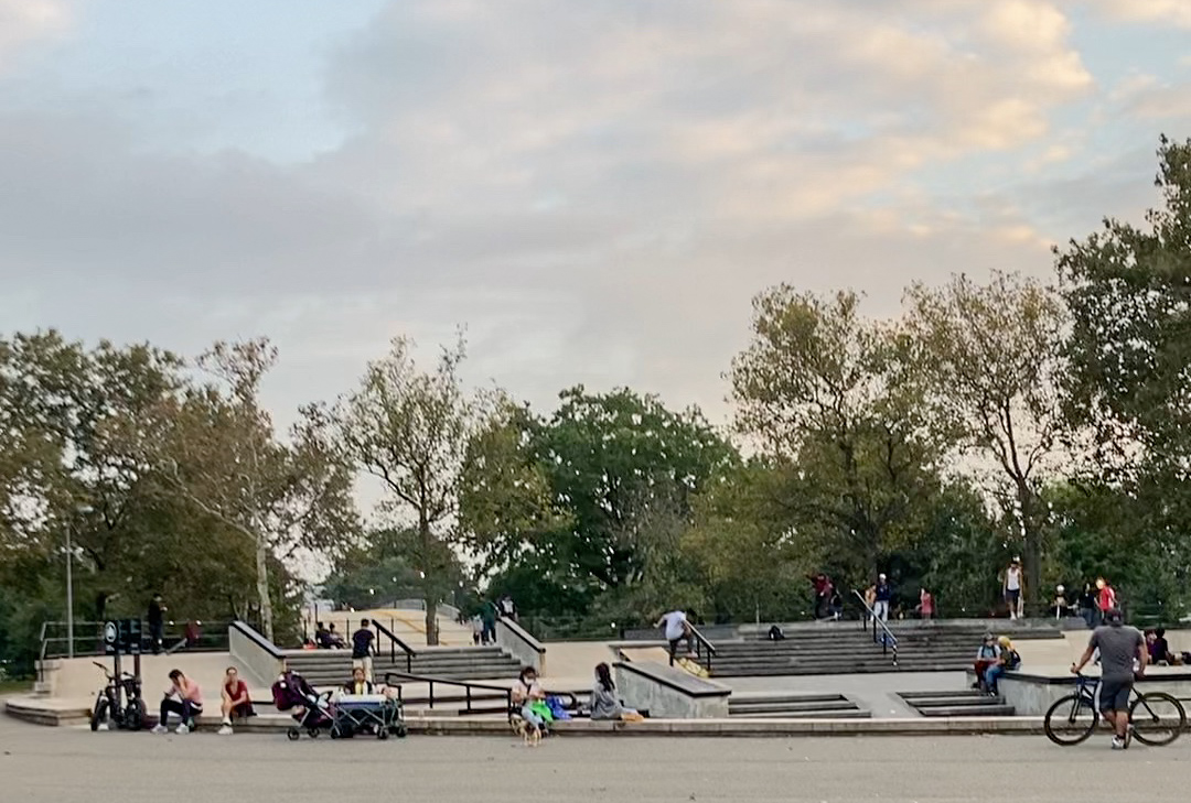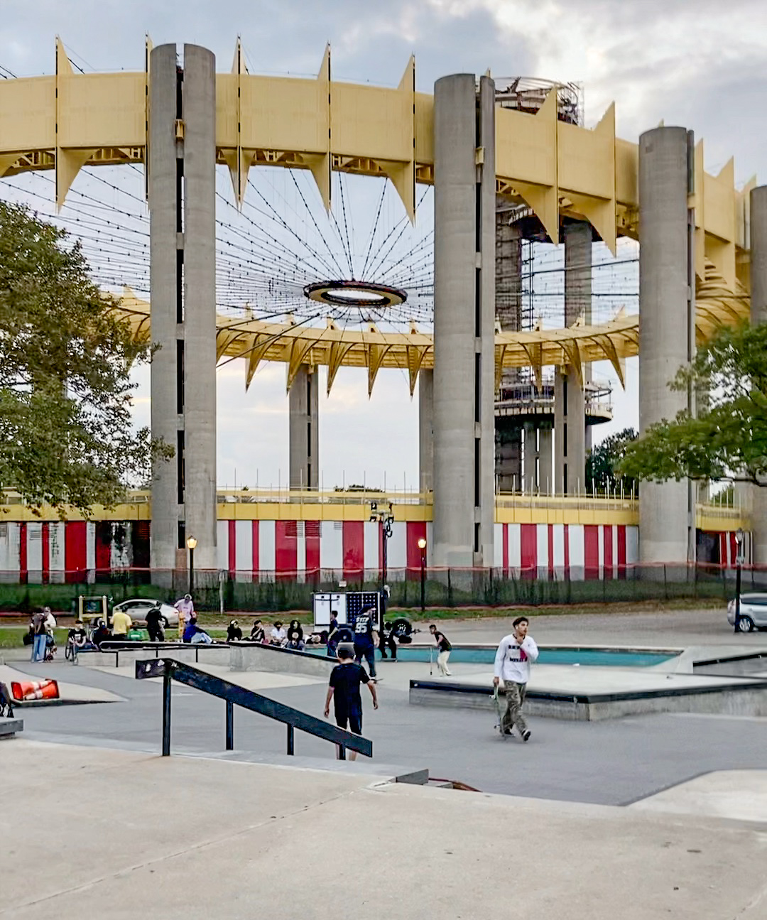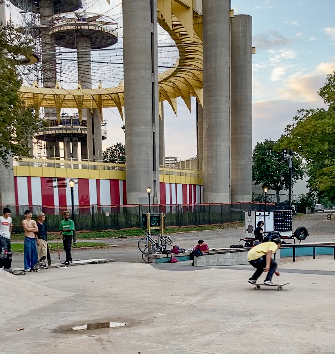 Some skaters hang out under the Unisphere, using the base of the fountain as a skate rink.