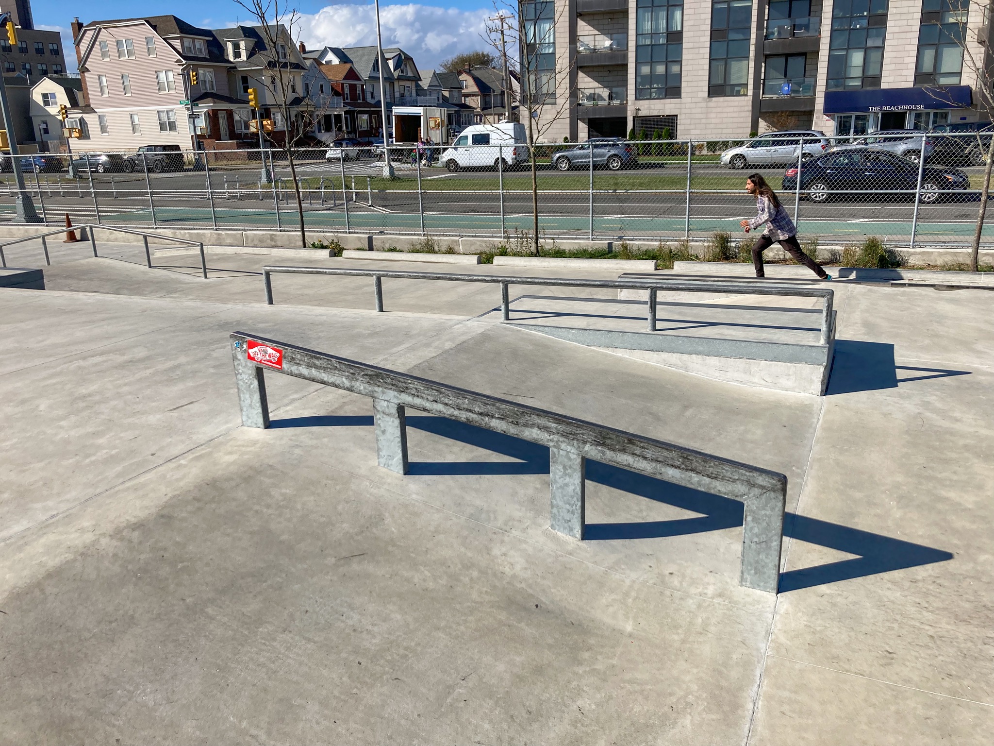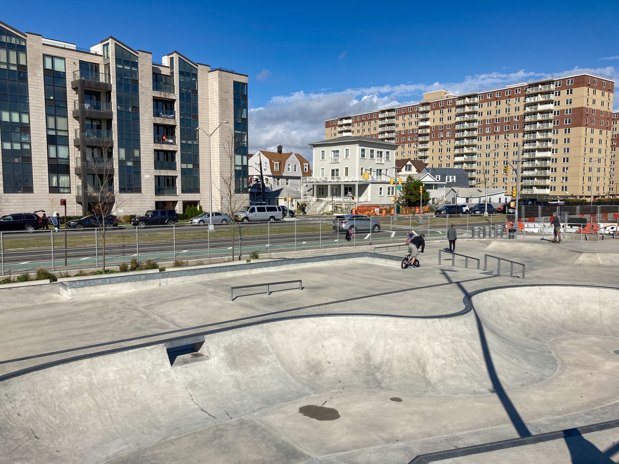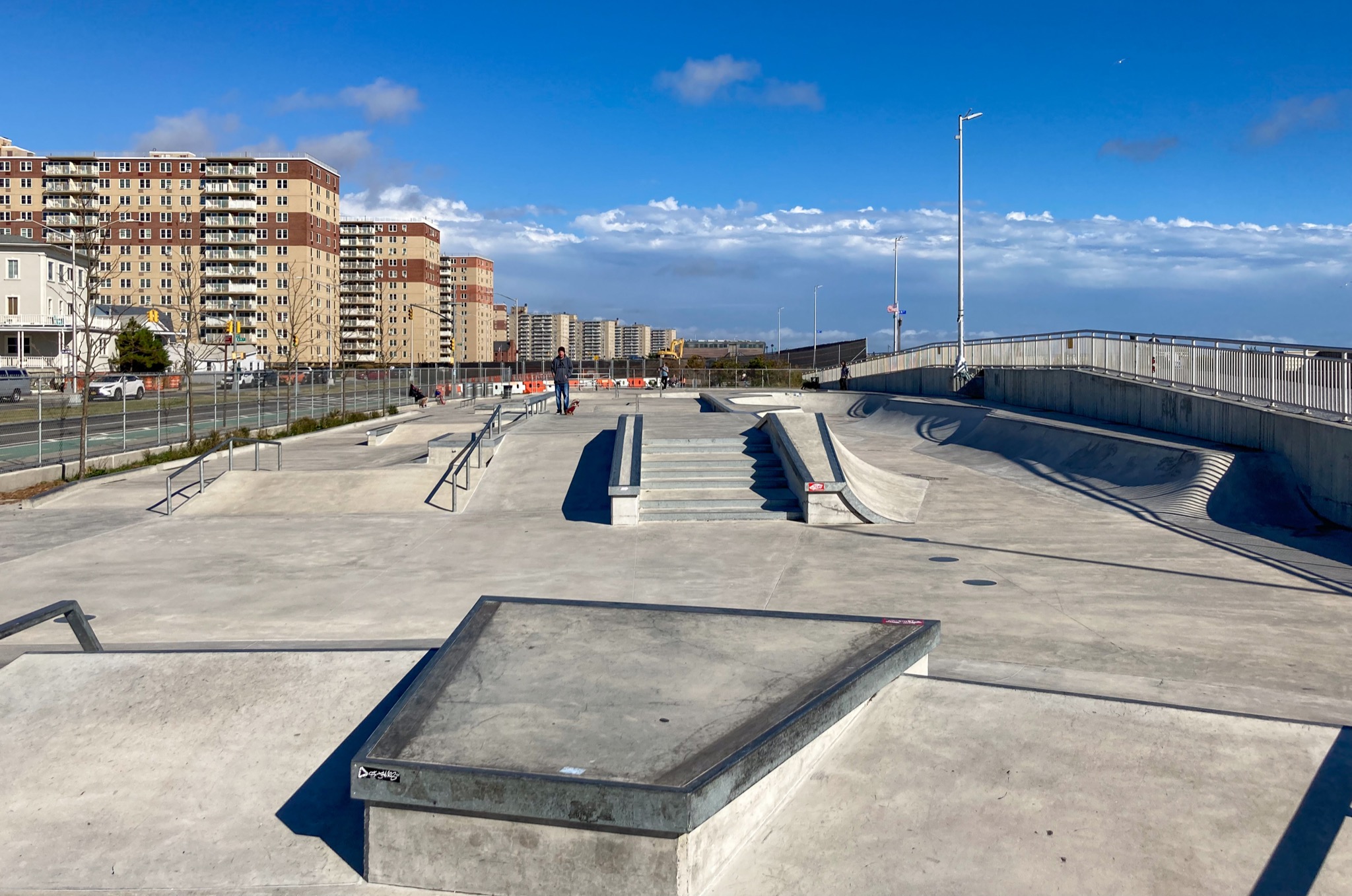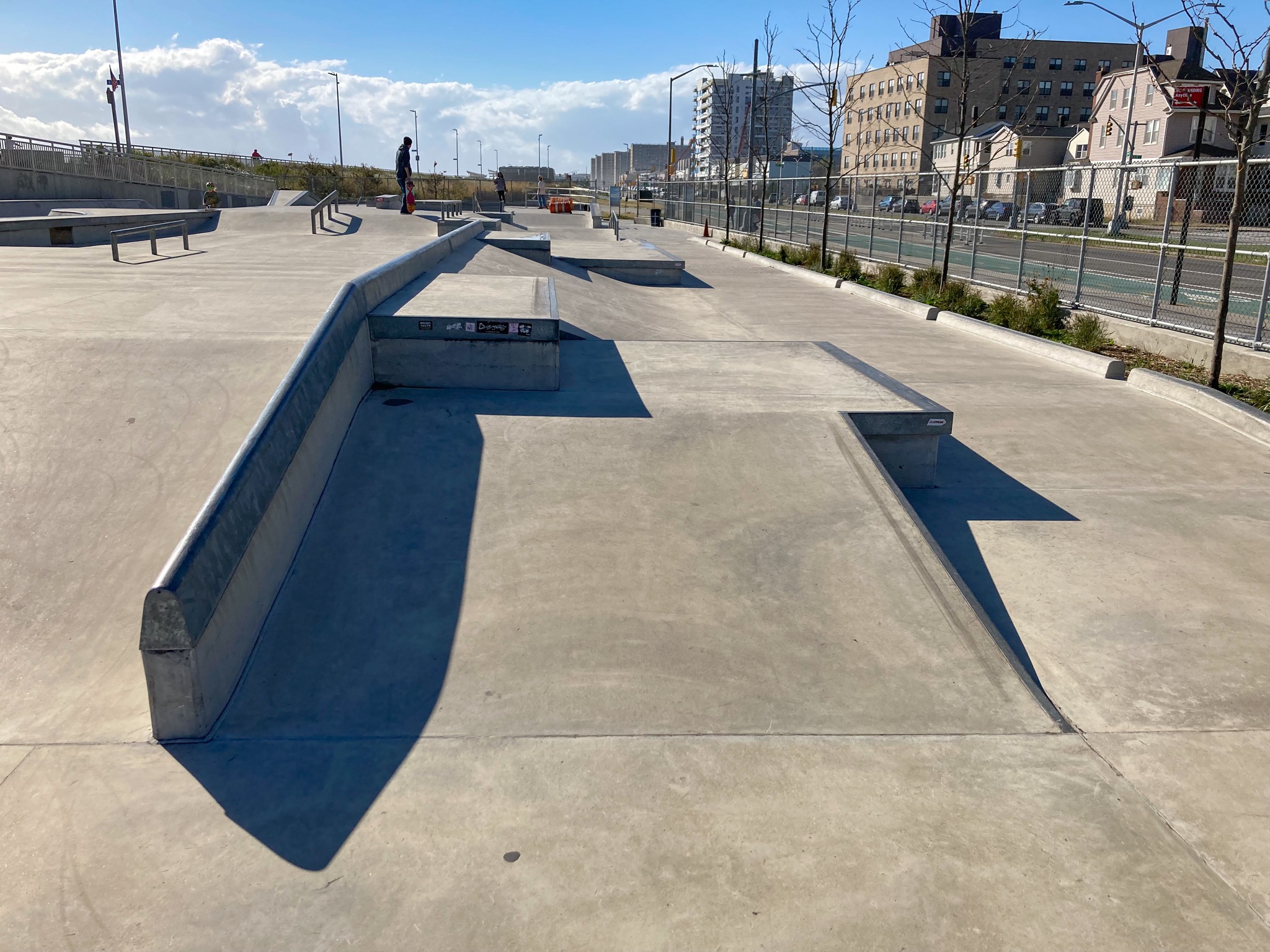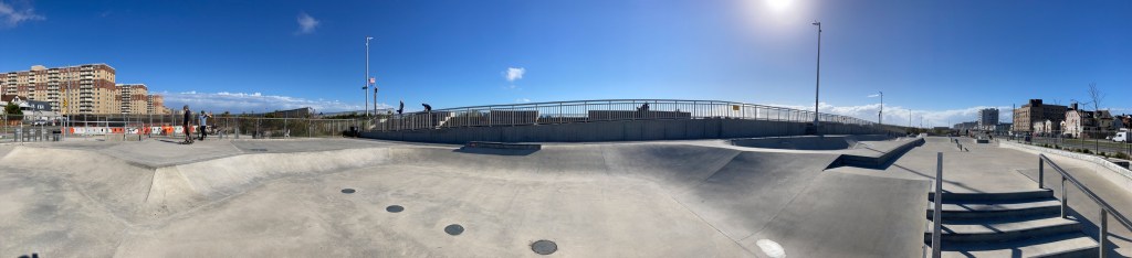 Rockaway Skatepark in Queens was destroyed by Sandy. It was rebuilt, then reopened in 2020. This new and large facility features butter-smooth surface at the writing of this article, with both street and transition elements, plus a long bowl which connects with the main skating plaza. Rockaway Skatepark is located at the west end of Rockaway Beach. The new boardwalk passes next to the skatepark. And the Atlantic Ocean is just 200 feet away. Its sister Far Rockaway Skatepark is located at the east end of the same beach, 3.5 miles away. This article is a part of my Public Skateparks on Long Island series.