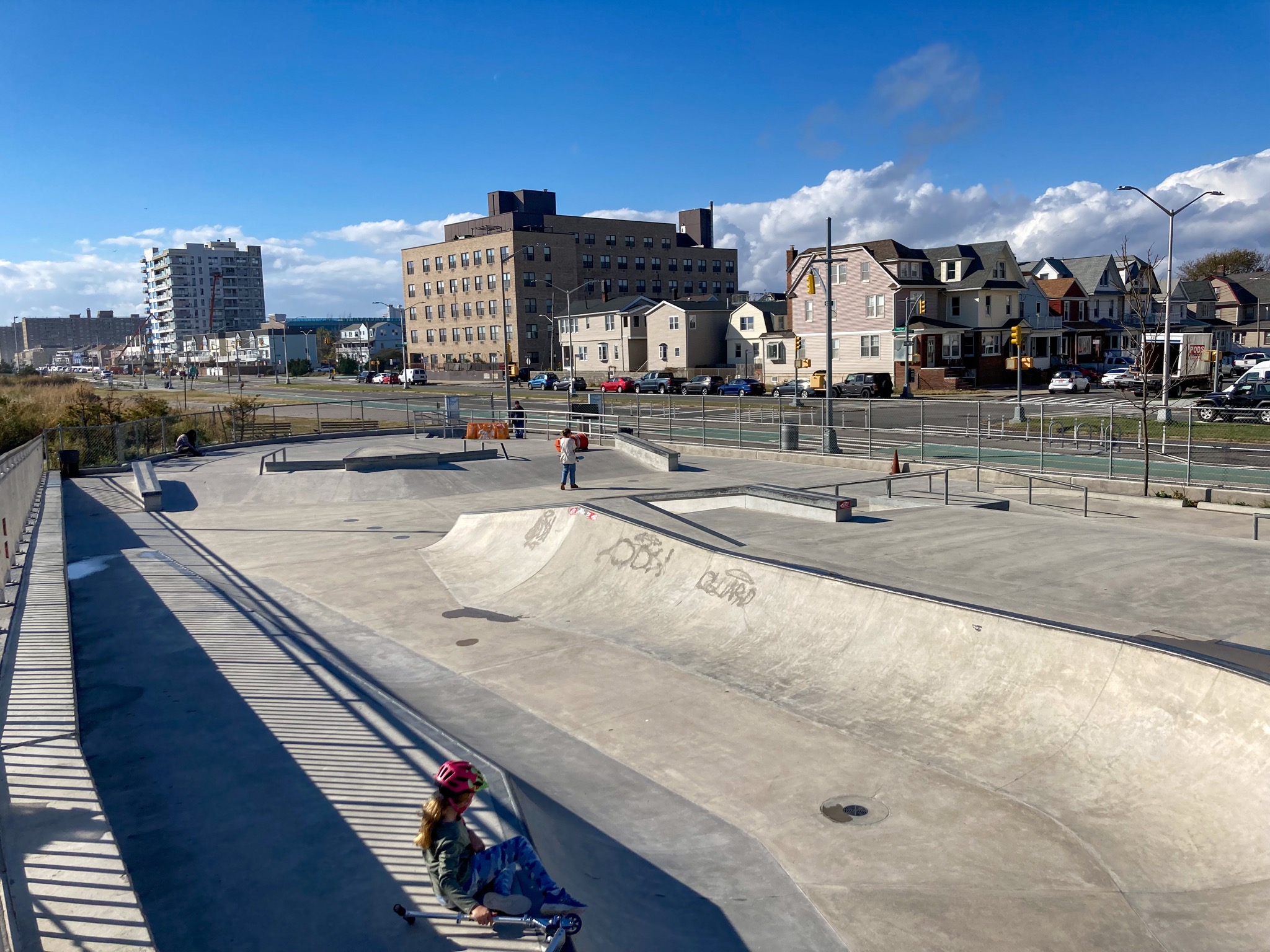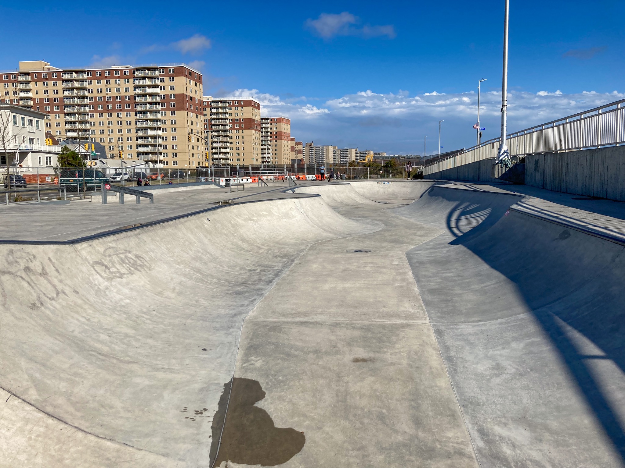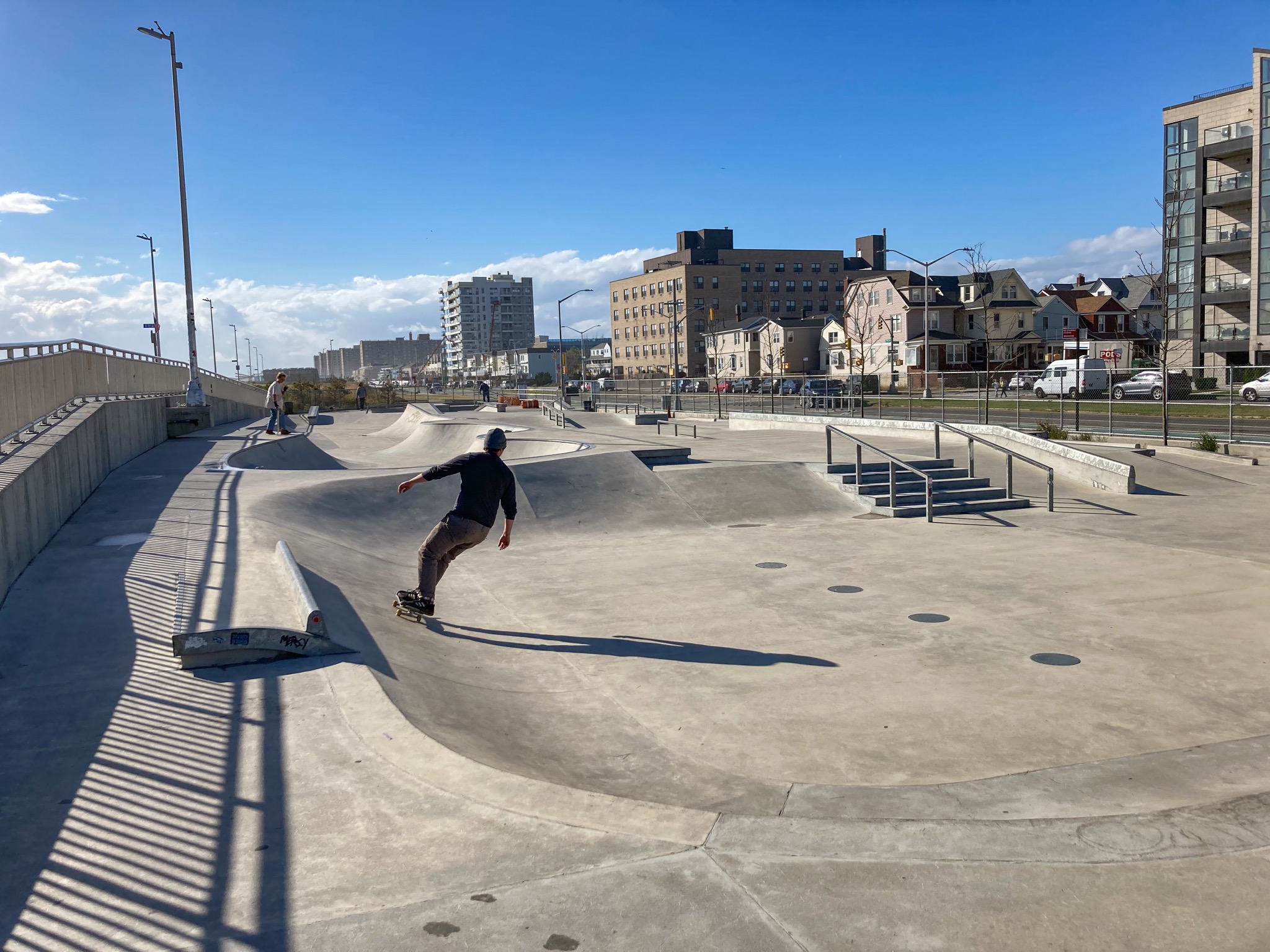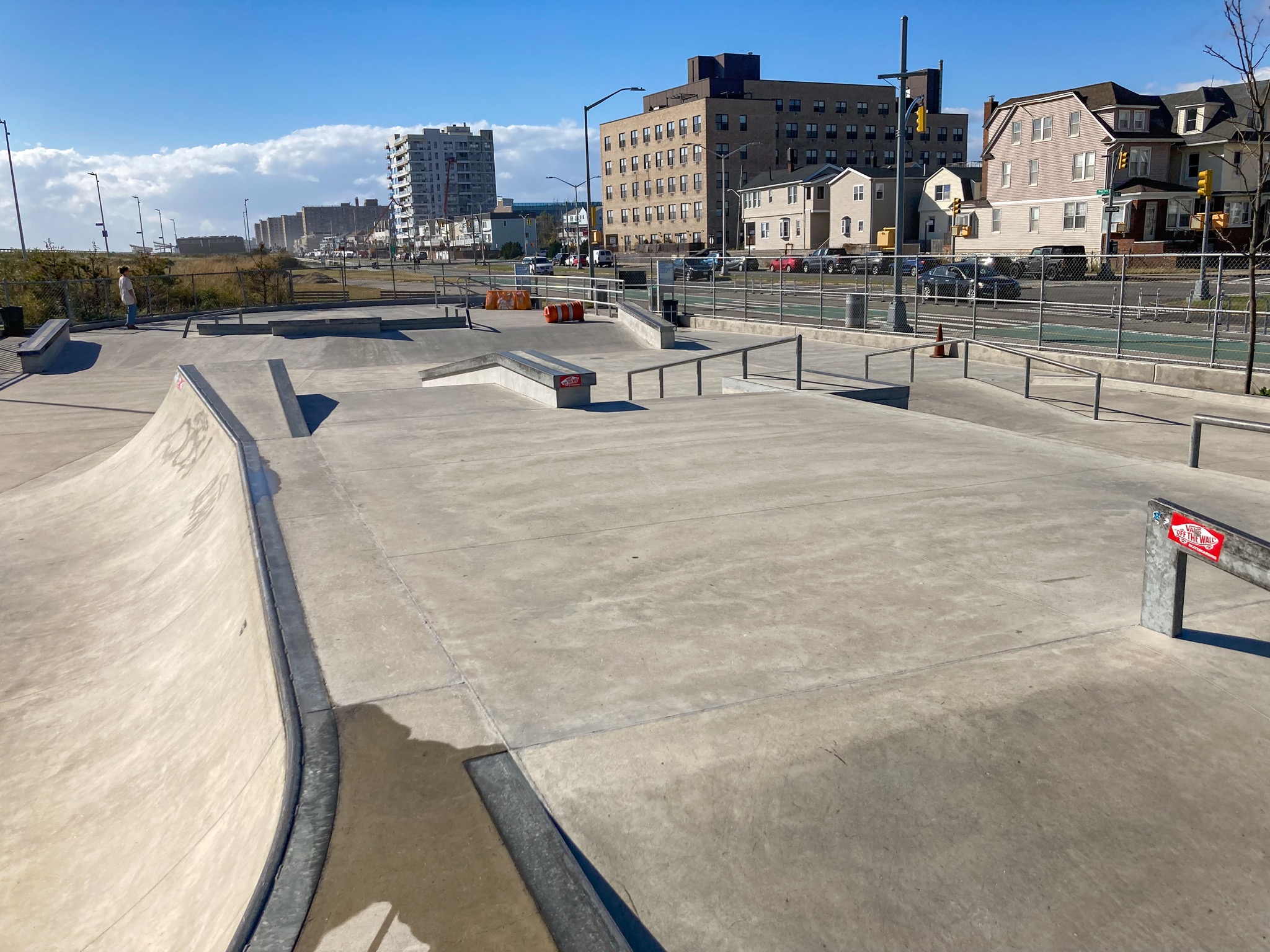 Rockaway Skatepark in Queens was destroyed by Sandy. It was rebuilt, then reopened in 2020. This new and large facility features butter-smooth surface at the writing of this article, with both street and transition elements, plus a long bowl which connects with the main skating plaza. Rockaway Skatepark is located at the west end of Rockaway Beach. The new boardwalk passes next to the skatepark. And the Atlantic Ocean is just 200 feet away. Its sister Far Rockaway Skatepark is located at the east end of the same beach, 3.5 miles away. This article is a part of my Public Skateparks on Long Island series.