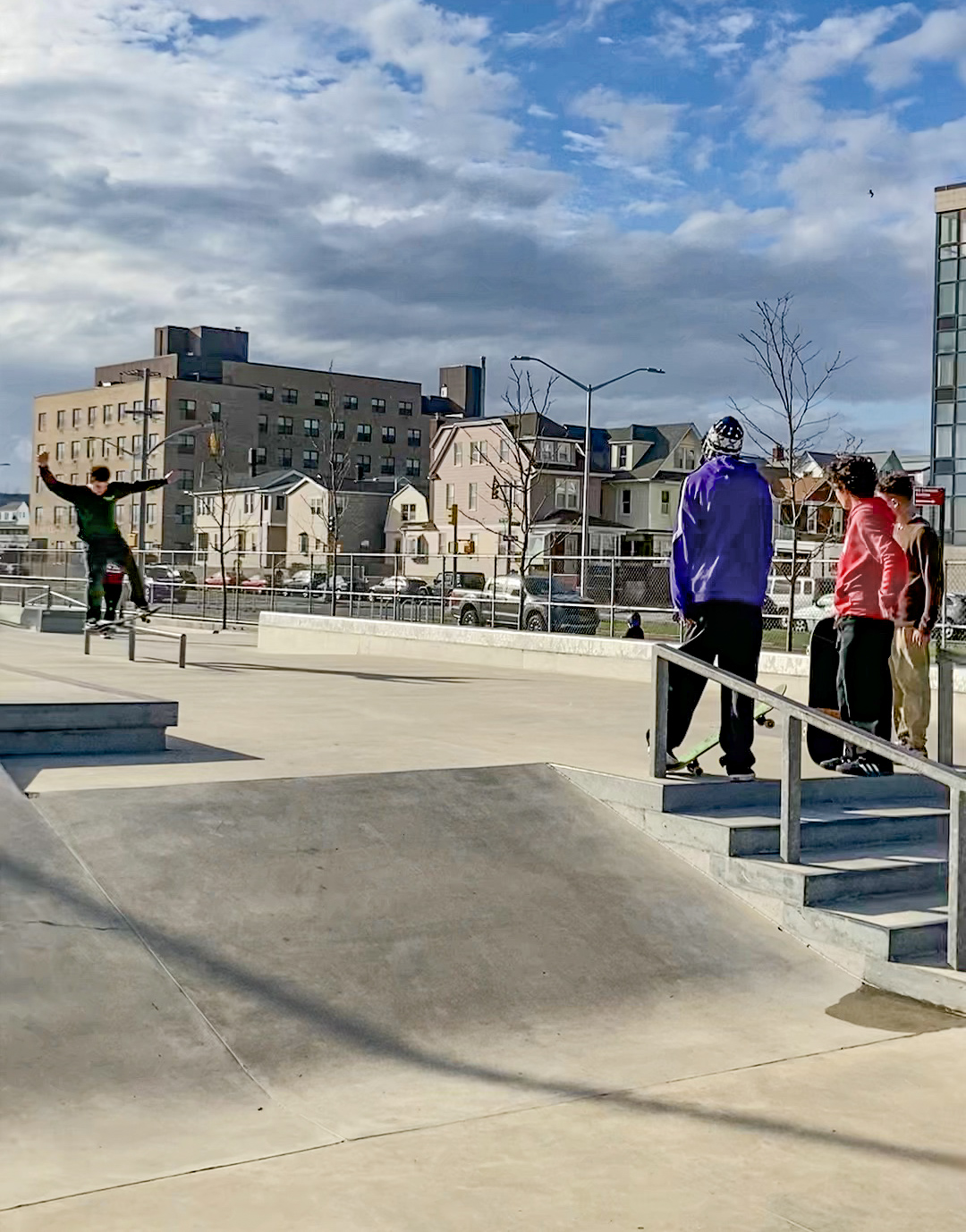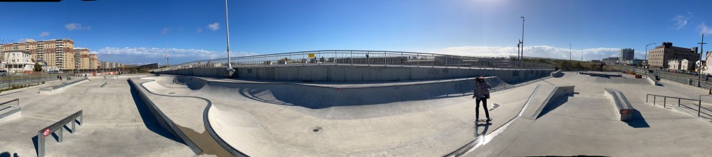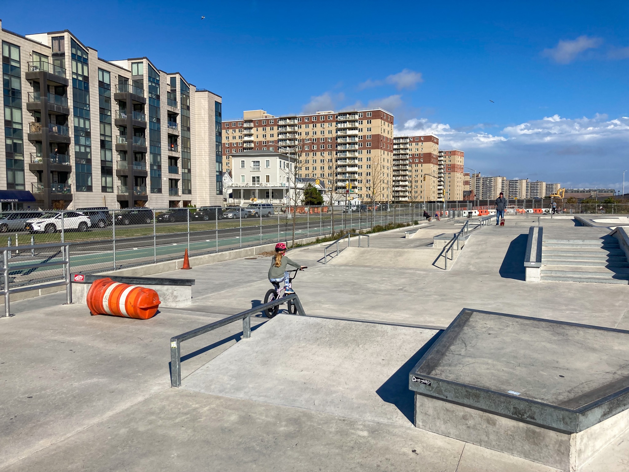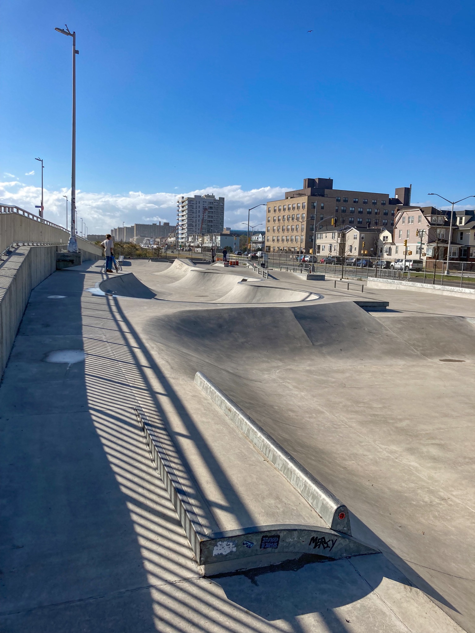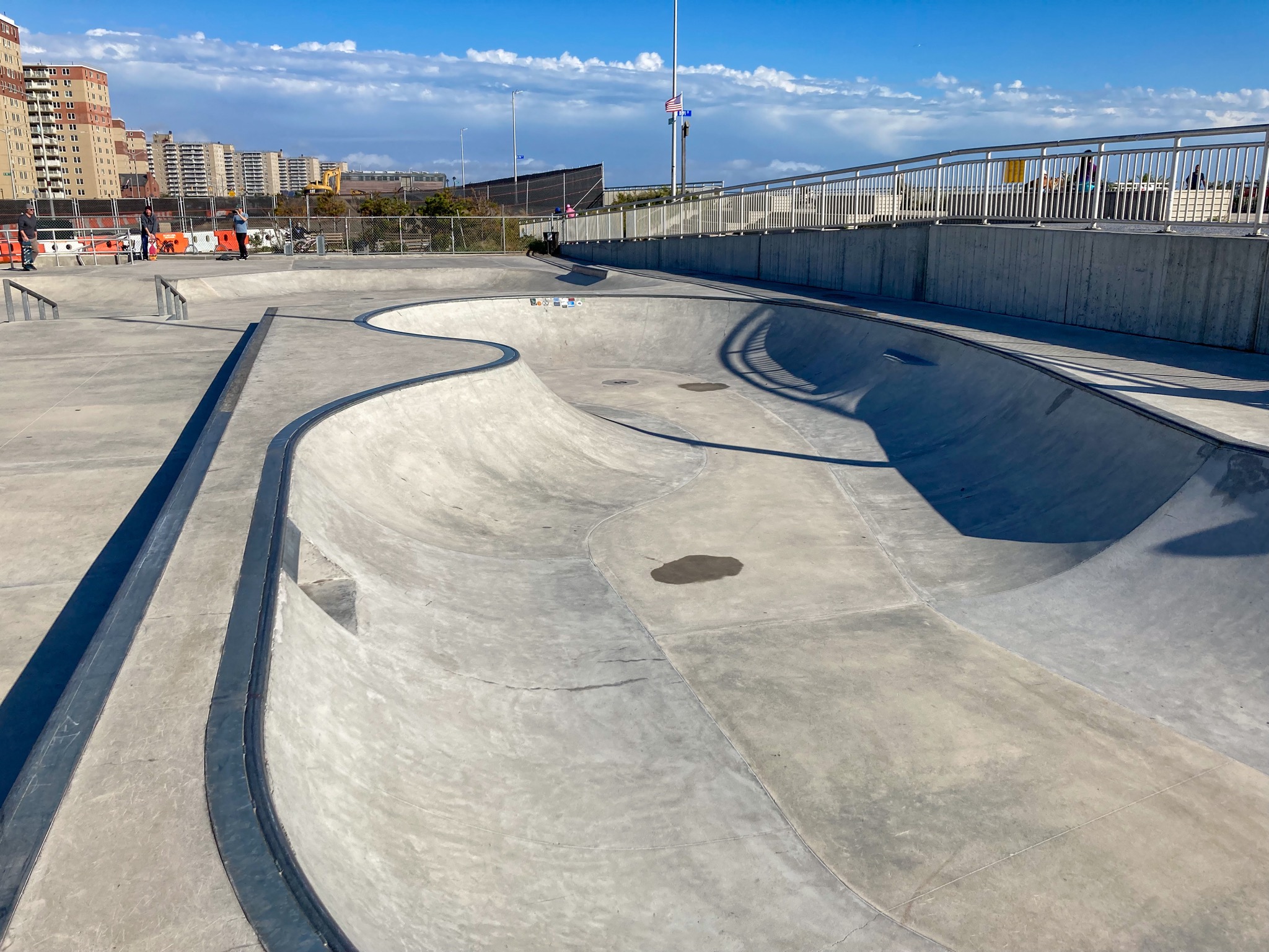Rockaway Skatepark in Queens was destroyed by Sandy. It was rebuilt, then reopened in 2020. This new and large facility features butter-smooth surface at the writing of this article, with both street and transition elements, plus a long bowl which connects with the main skating plaza. Rockaway Skatepark is located at the west end of Rockaway Beach. The new boardwalk passes next to the skatepark. And the Atlantic Ocean is just 200 feet away. Its sister Far Rockaway Skatepark is located at the east end of the same beach, 3.5 miles away. This article is a part of my Public Skateparks on Long Island series.