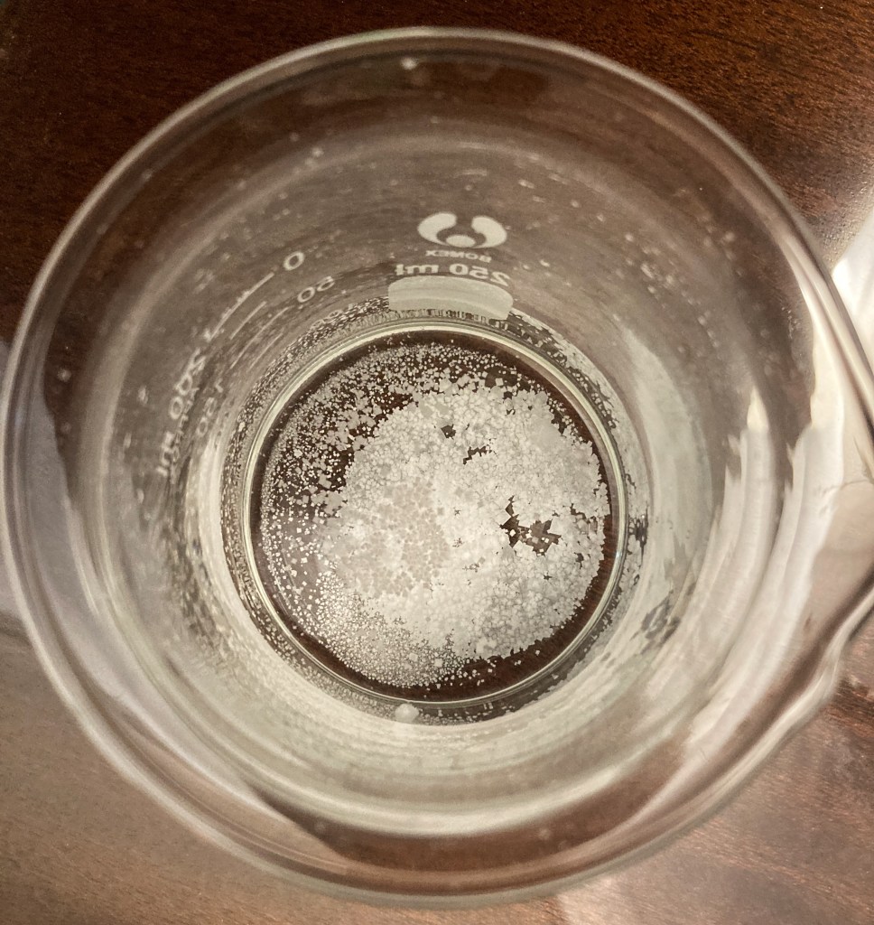 But there were crystals forming on the surface of the solution as well. That was unexpected. But I suppose it did make sense. I didn’t think much about these surface crystals. I took a pen and knocked all of those annoying surface crystals down. They all sunk to the bottom.
