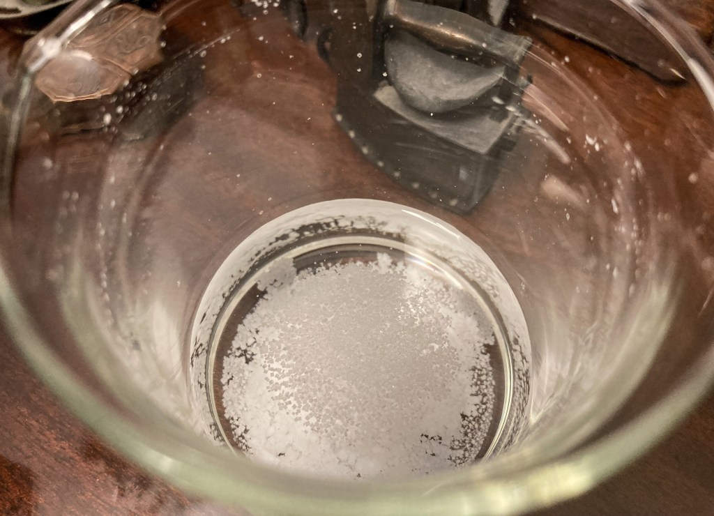 I took a look at the glass two days after. This was not a proper experiment. Recall that I did not expect anything other than big crystals forming at the bottom. I wasn’t going to write down notes, or even take pictures. In fact, I forgot to check on the solution on the second day.