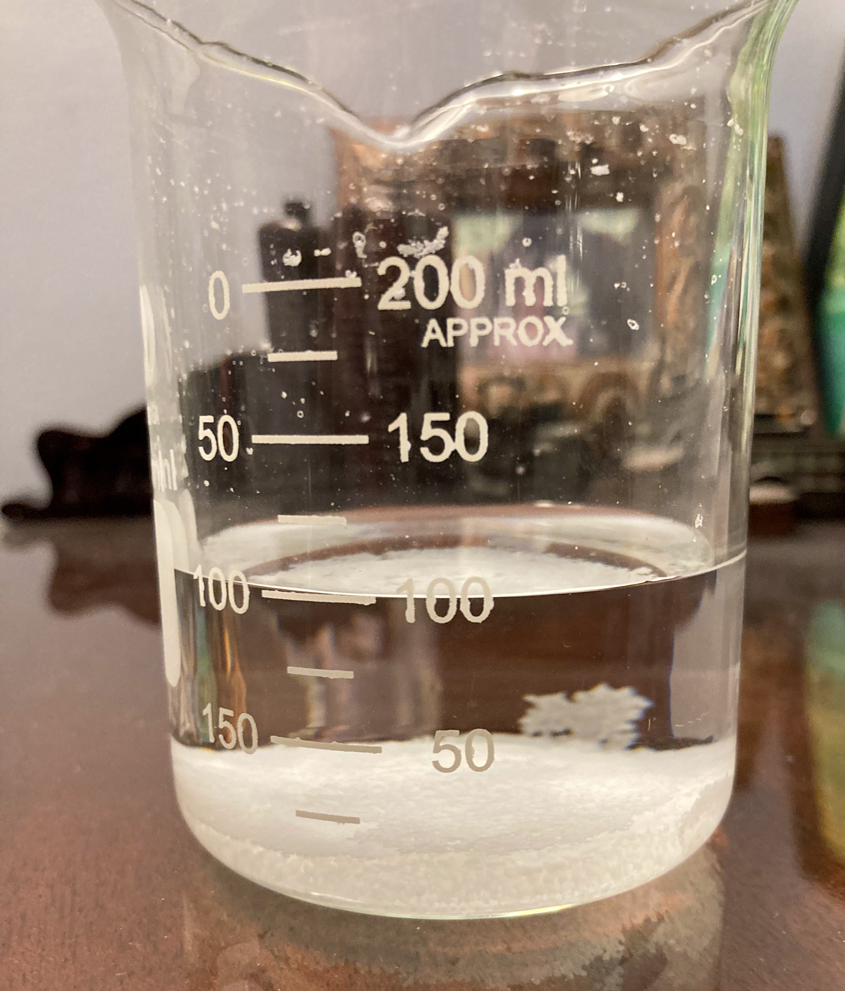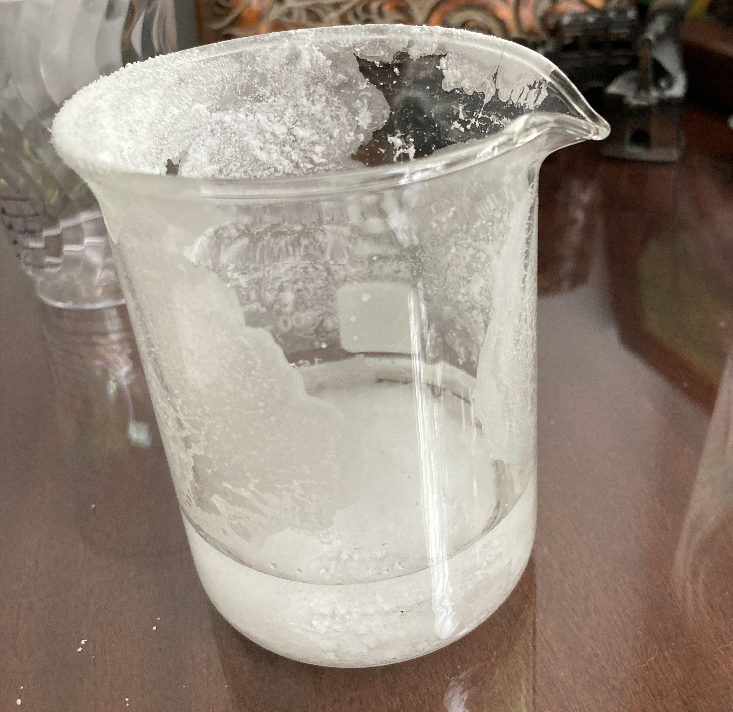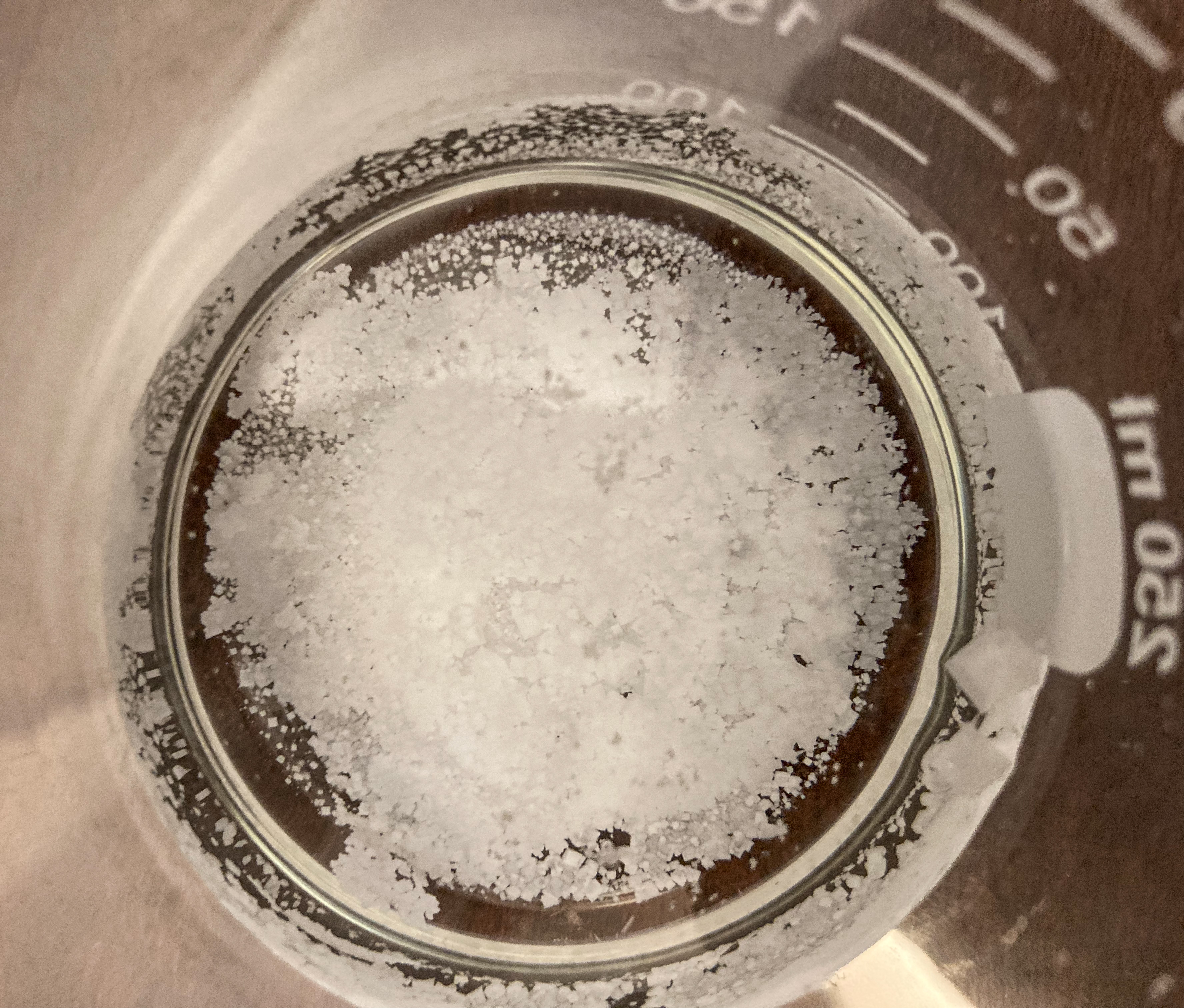Here is a comparison of the same glass cylinder on day 1, and after day 25. The difference in weight is almost the 100 g of water that went into the saturated solution on day 1.