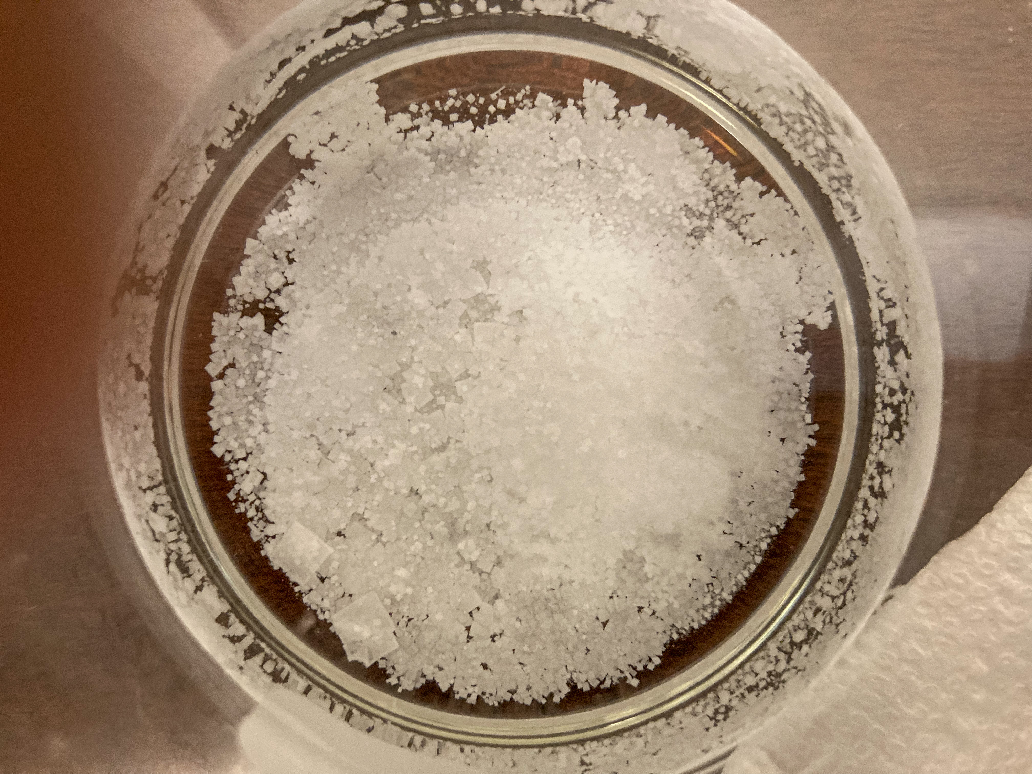 There were indeed a lot of additional salt crystals at the bottom of the glass. And they were all bigger than the fine crystals of table salt that I started with. Some grew from those table salt crystals. Others just decided to show up elsewhere on the bottom of the glass.
