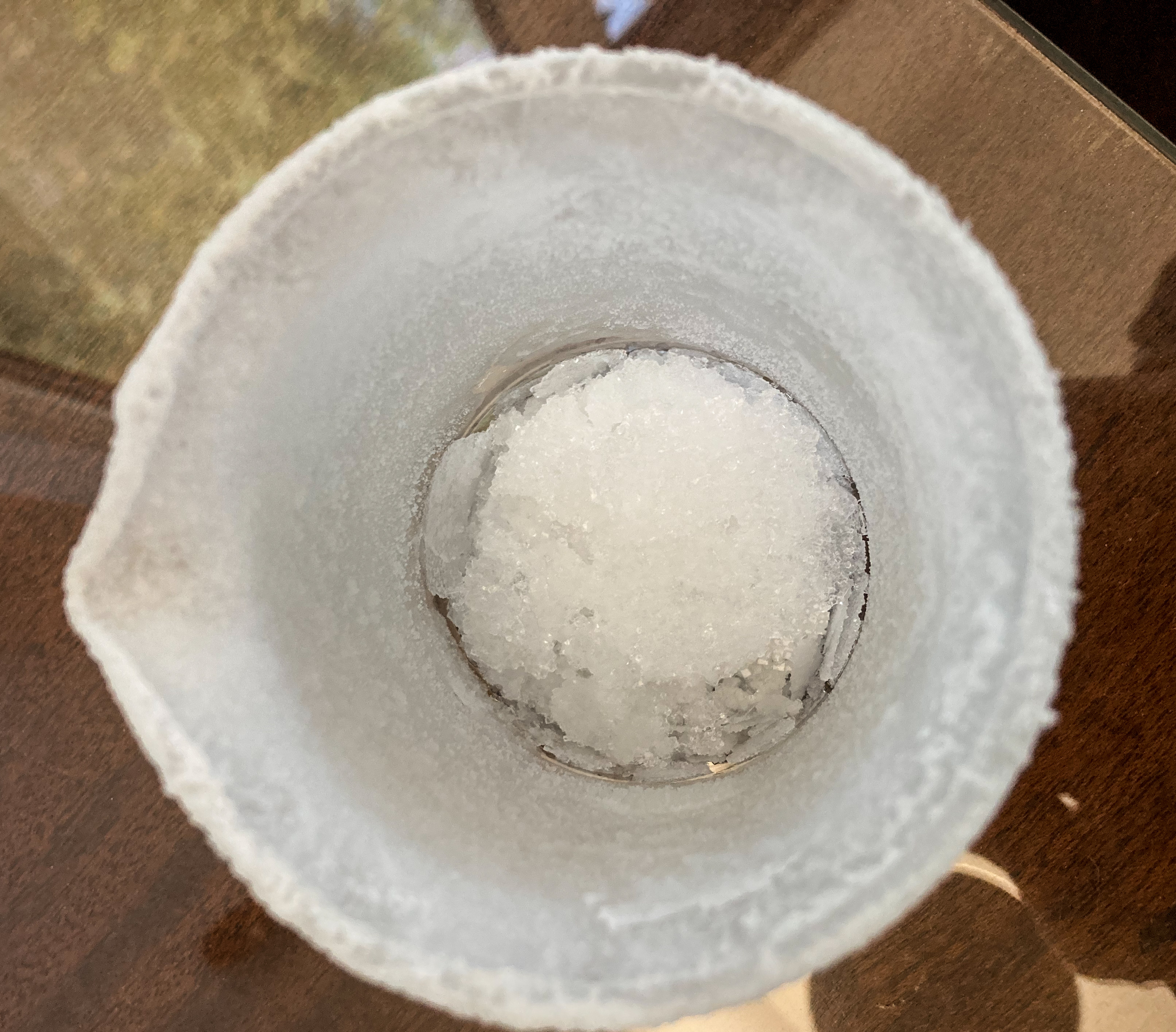 It wasn’t clear to me when the solution completely dried up. By day 25 when I checked, all water was gone. There is now a thick rind of salt crystals encasing the glass cylinder. Pictures shown below were taken on day 25, and after. It made no difference, now that the solution had turned into pure crystals.