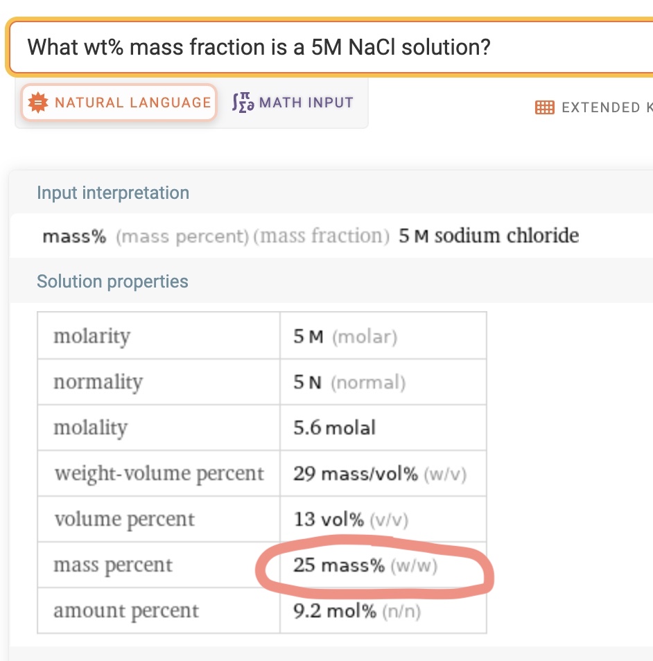 However, I typed “What wt% mass fraction is a 5M NaCl solution?” into Wolfram Alpha just now, after having written all of above.