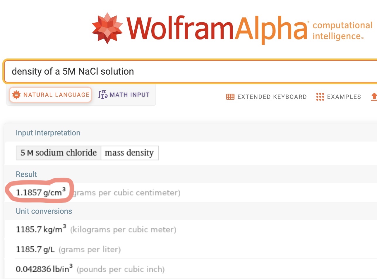 It turns out Wolfram Alpha does know about the density of a 5M NaCl solution, as shown on this query page for “density of a 5M NaCl solution”. It says the density of 5M NaCl is 1.1857 g/cm3 which seems right.