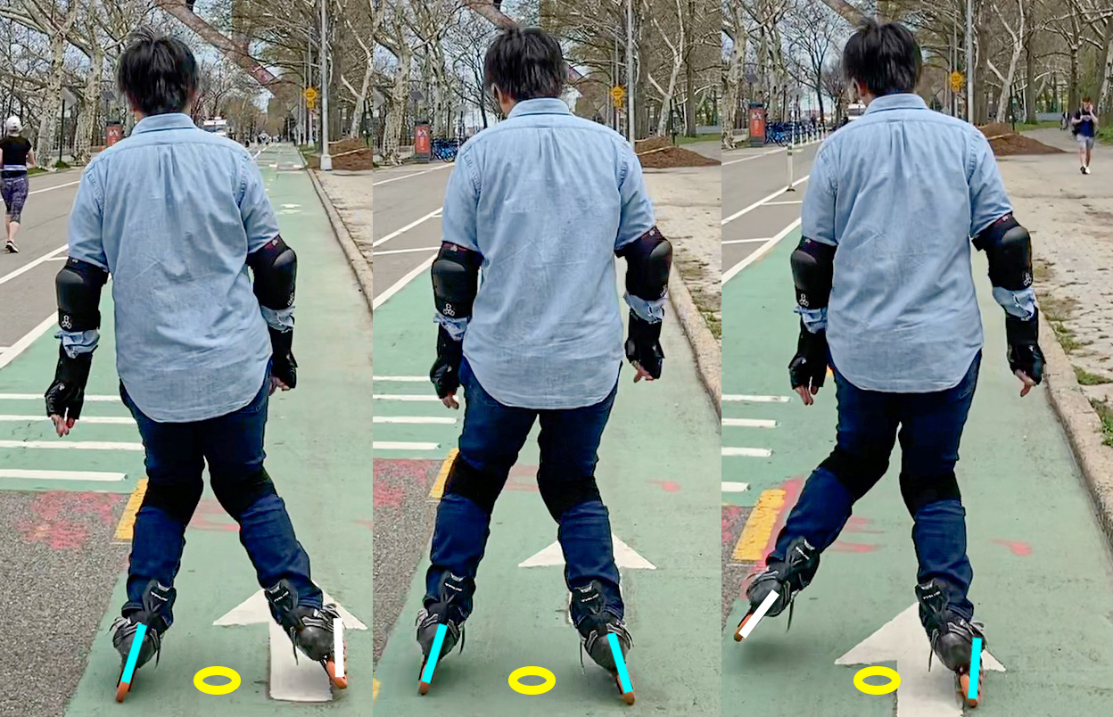 Below is a stop motion sequence showing one forward cross roll movement from the above video. In the leftmost image of a skater, a yellow circle indicates his projected center which is far away from his gliding (right) skate. The skater is in a fall to his right side. But his left skate has crossed over in an attempt to recover from this fall. In the second lefmost image, the left skate has now landed on the ground, exactly on top of his projected center. This is indicated by a red bracket, showing that this is a “balance moment”. The left skate now becomes the gliding skate, and the right skate becomes the free skate.