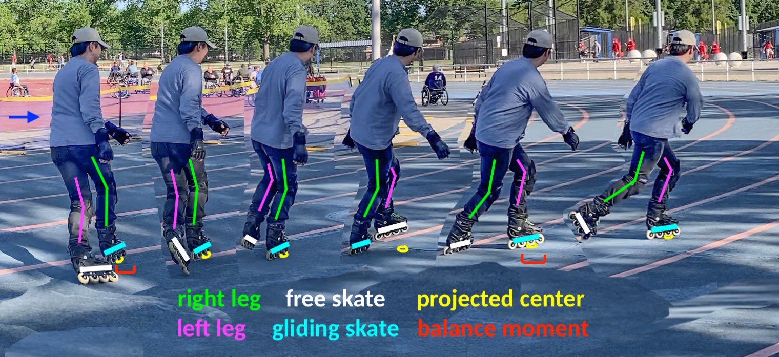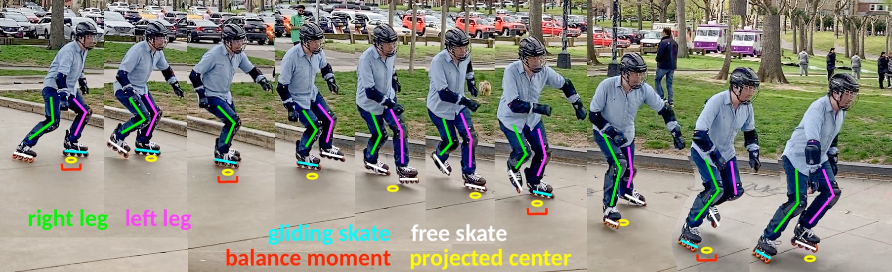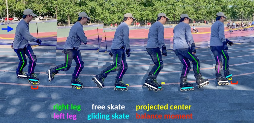 Let’s look at the same sequence from earlier, with annotations. The skater starts out leaning to the left while gliding on his left skate. He is about to fall to the left, but during the fall he moves his right skate, the free skate, over to his left side. He catches his balance at the last second, by planting his right skate on the projection of his shifted center of gravity. I call this moment a balance moment, indicated by a red bracket.