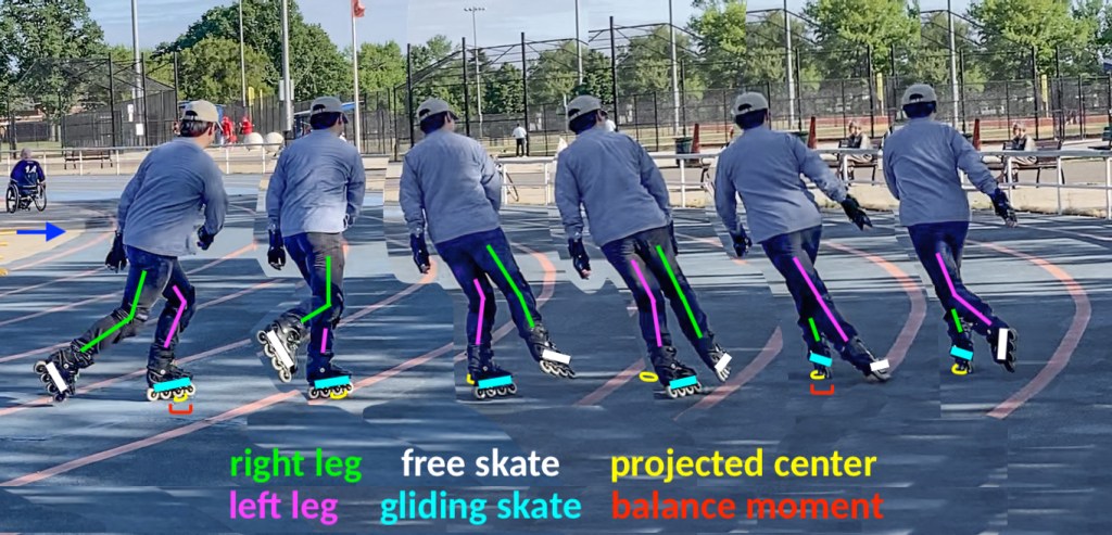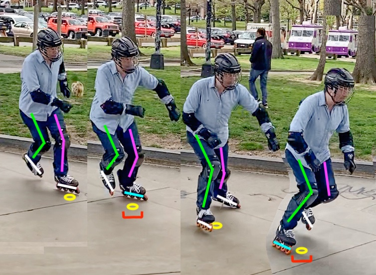 One characteristics of a “fast walk” is that at each balance moment marked by a red bracket, a skate does not always touch down on the current projected center of gravity marked by a yellow circle. Usually the upper body has already moved in anticipation of the next lunge.