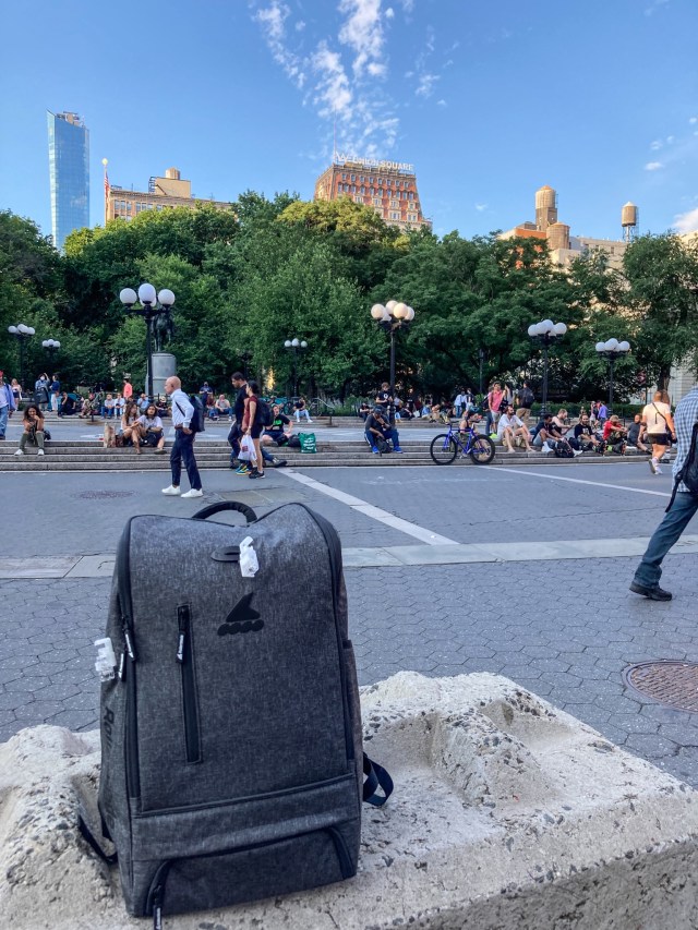 A typical WNS Wednesday starts with a handful of skaters hanging out at the appointed south-side steps of Union Square, as early as 7pm. An average route lasts two hours, covering about 12 miles. Seasoned skaters come prepared, with enough water, light reflection tapes, LED lights, and everything else that may be needed. Some people skate to Union Square. Others put on their skates at the steps. Yours truly bought a skate bag just for this event, as shown below, with the south-side steps in the background.