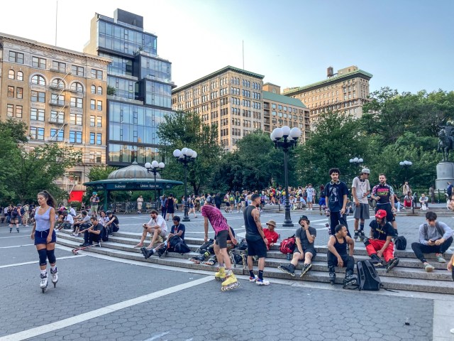 At exactly 8pm, the crowd suddenly grows two to three times larger. It’s not clear whence skaters appear out of thin air.