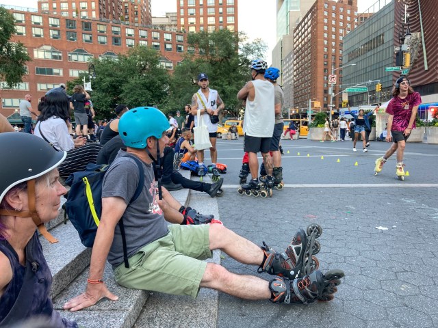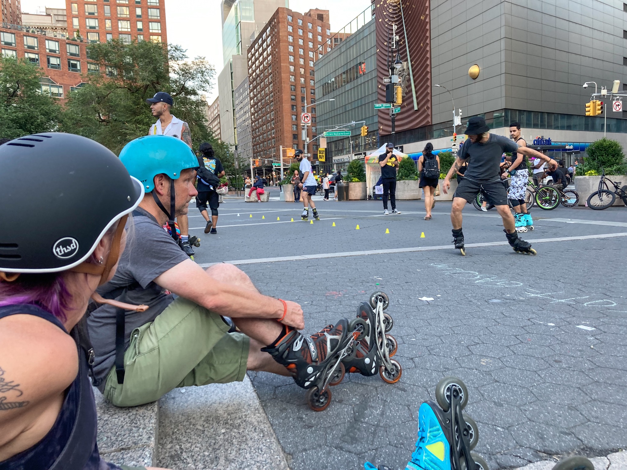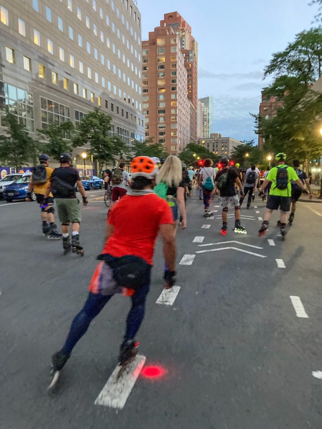 Manhattan is a surprisingly hilly city. One doesn’t usually appreciate this because tall buildings hide the profile of the land from one. The expedition circuit includes sections that go downhill drastically, to the point that I felt unsafe sailing down at high speed, unless I applied intermittent braking. I hear that they also take bridges across NYC boroughs at times. You will need to know how to safely brake (not stop) to reduce your speed, while cruising at very high speed downhill. At a red light, you need to know how to stand and be stable on an inclined surface. At the same time, you must track skaters barreling down towards you, and be prepared to react as needed.