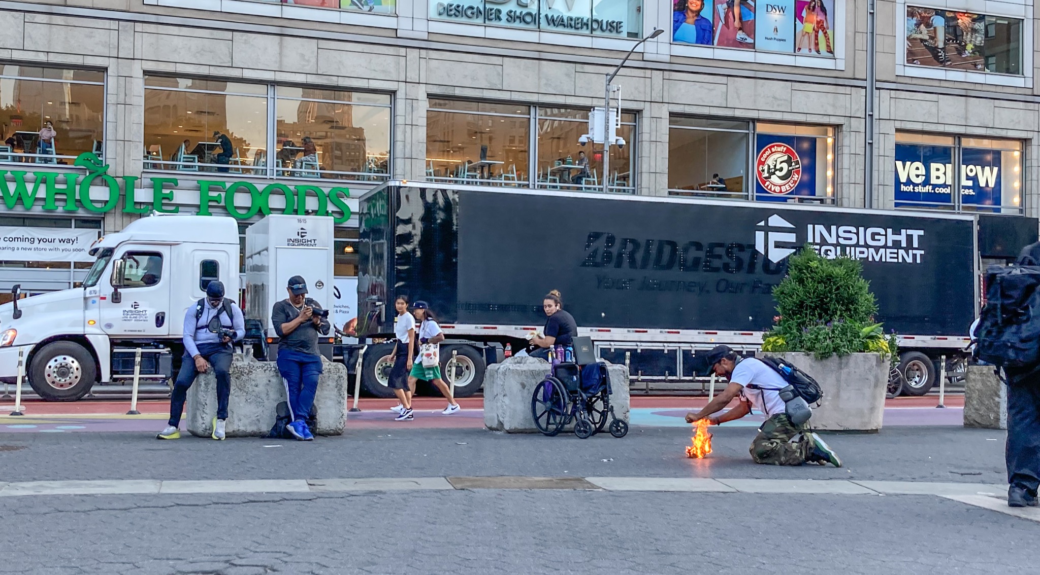 This being the world-famous Union Square, there is always something to entertain folks waiting for the event to start. On this particular day, someone tried to burn a very large paper bag. Then with encouragement from onlookers, our hero proceeded to prove that his hands were in fact resistant to fire.