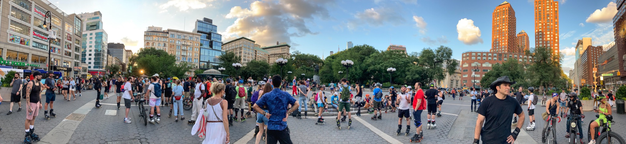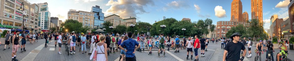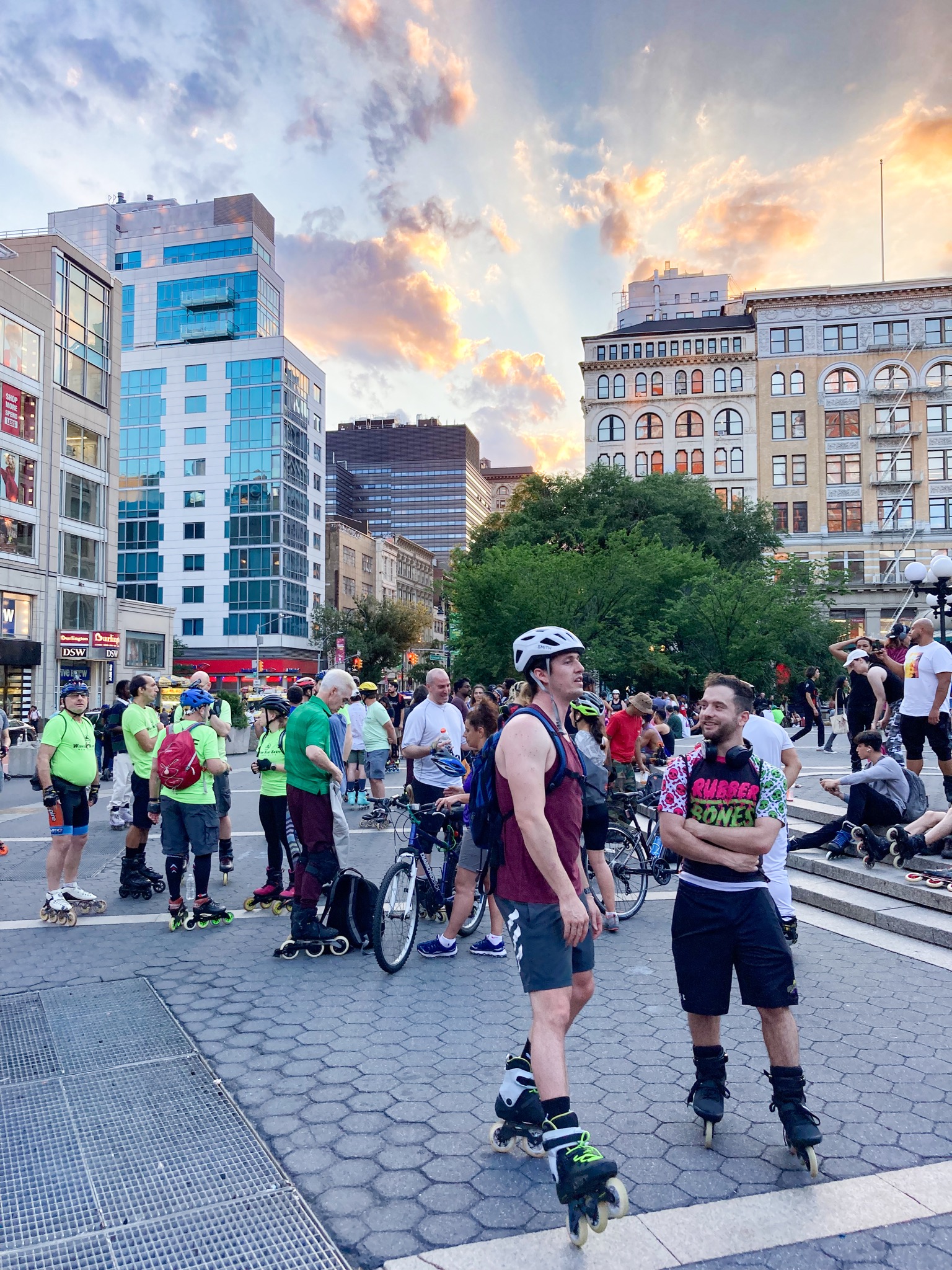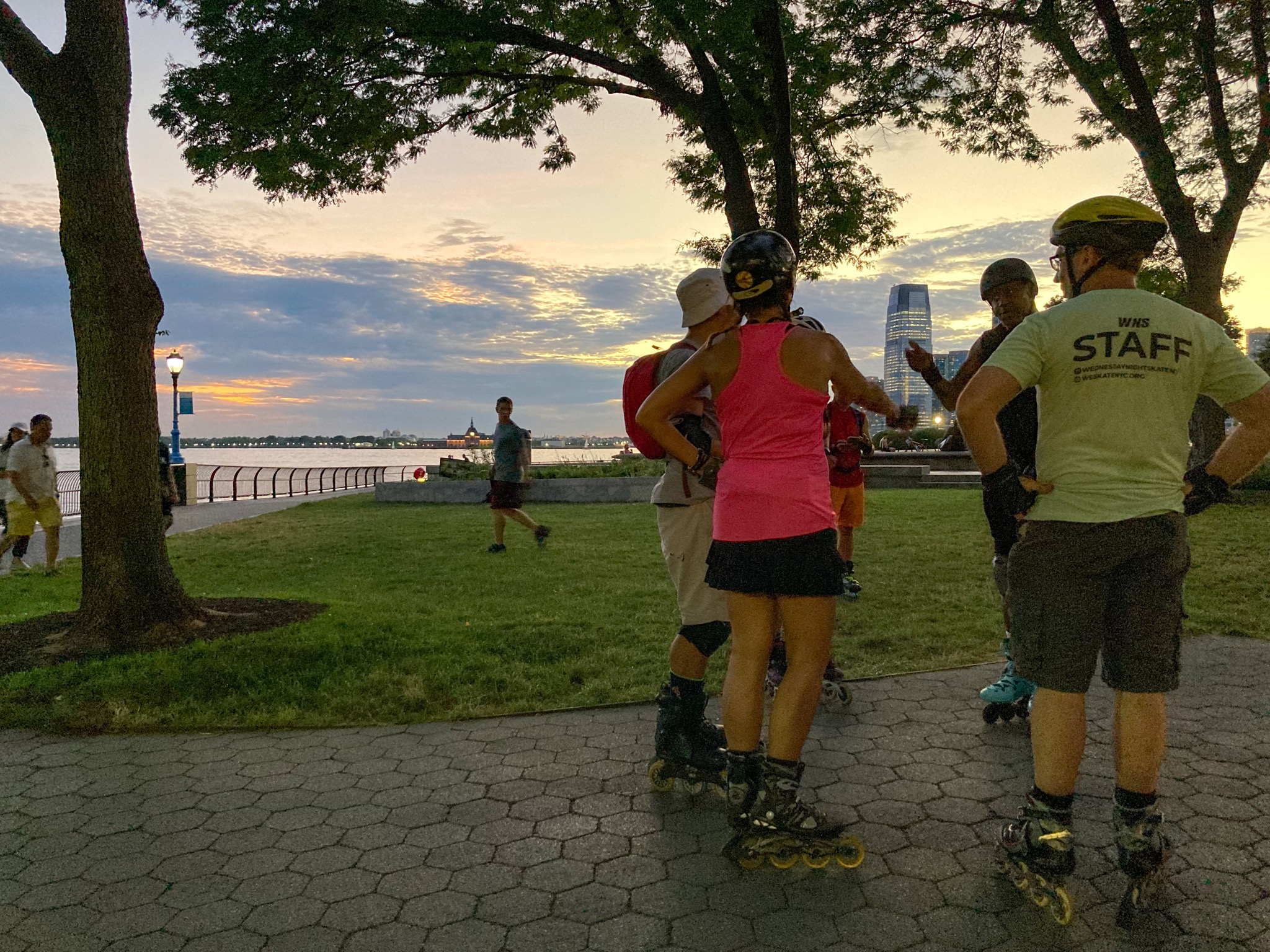 Wednesday Night Skate NYC is also known as WNS NYC. It’s one of several well-established groups in the city. Some say it’s the biggest group of them all. WNS is run by volunteers since the late 1990s. Every Wednesday from April to October, weather permitting, organizers show up wearing yellow-green vests at the south-side steps of Union Square around 7:45pm. By then a sizable crowd of skaters have already gathered at the steps. At 8pm an organizer gives a brief safety speech and introduces the route planner of the week, as even more skaters materialize all of a sudden at the steps. One organizer is appointed the leader of the day, and another the sweeper. Folks are told not to skate ahead of the leader. The sweeper makes sure to leave no skater behind. Shortly after, skaters launch like a swarm of giant locusts, to descend upon the streets of New York City at dusk. The leader signals followers to take breaks at pre-designated stops along the route, so that the rest of the group may catch up, with the sweeper being the last person to arrive at each stop. The route circles back to Union Square, where a day’s skating concludes.