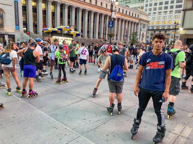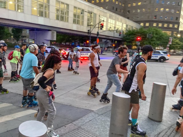 When the crowd numbered in the hundreds, one observer likened the flash mob of skaters to giant locusts from Jurassic World Dominion. Vehicle and pedestrian traffic halted in awe of the spectacle.