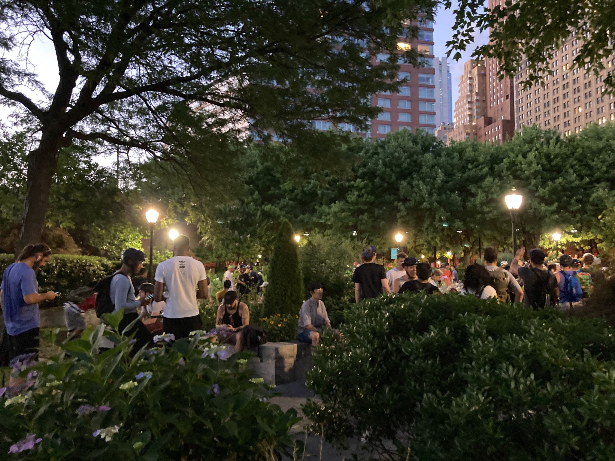 The event usually lasts two hours. At some point, the night sets in. Here is the crowd resting at Battery Park.