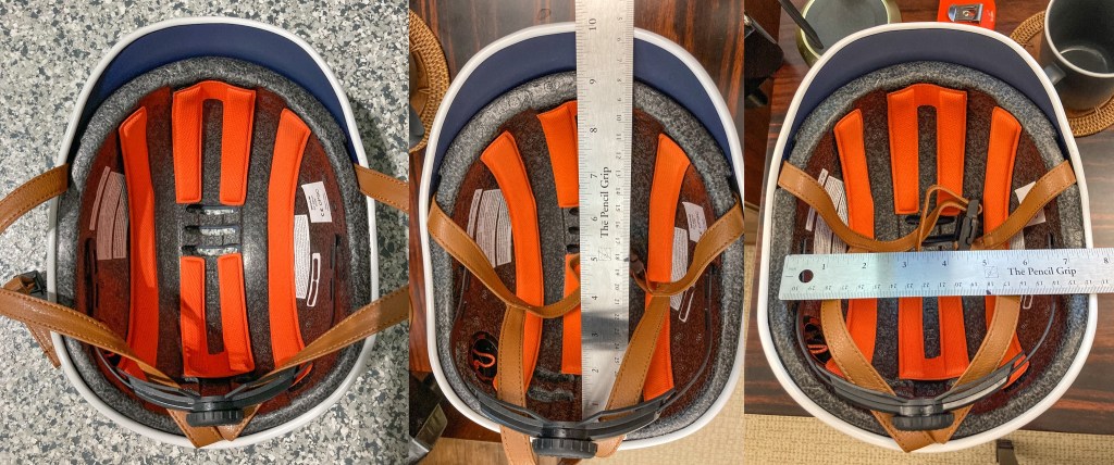 Coincidentally or not, this slightly-off sizing chart happens to work well for Asian Americans. As I mentioned earlier, Asian Americans often need to order helmets one size up, with respect to specified circumference-to-size mapping. With Thousand Heritage, this is not necessary. The 1.232 ratio and the “run large” nature of its sizing chart make a Heritage helmet fit the width of a typical Asian head. To be sure, the helmet still leaves gaps in the front and in the back. This can be fixed by adjusting the strap, as shown above right.