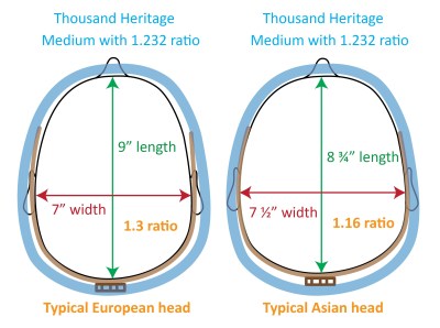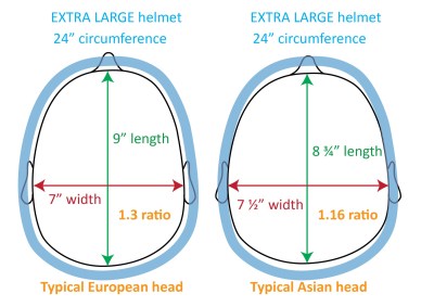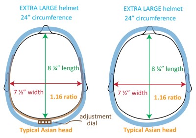 Helmets sold in the US are molded to the average shape of European heads, roughly with a 1.3 ratio expressed in length over width of the head. In visual terms, you can picture a human head measuring 9″ from forehead to the back, and 7″ from ear to ear, shown below left. It’s got the shape of an oval, if you look at the head from top down. But Asians have a rounder head shape, with an average ratio of 1.16 instead. Picture a human head measuring 8 ¾” from forehead to the back, and 7 ½” from ear to ear, shown below right.
