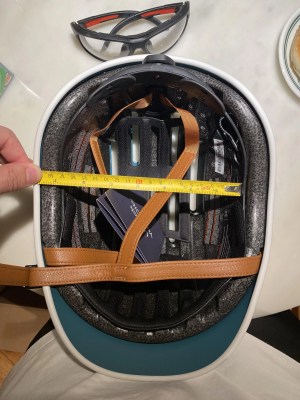 Thousand Heritage is the “roundest” helmet, with a 1.232 ratio. This is in fact rounder than the supposed “Asian-fit” Giro Aeon, at a 1.247 ratio. While the Thousand brand never advertises its helmets as roundish or Asian-fit, its Amazon reviews are full of non-Asians complaining how “round” this helmet is. I don’t believe that this helmet is “that” round, for a typical European head. The perception of roundness and gaps created on the two sides of the head is partly an illusion. This helmet “runs large”, in the words of company representatives who responded to user complains and questions. That is, their advertised sizing chart is a bit off, with respect to accommodated circumference measures. Many customers ordering this helmet online will find the helmet slightly bigger all around than expected. But European Americans can compensate for this easily using the adjustment strap, as shown below left.