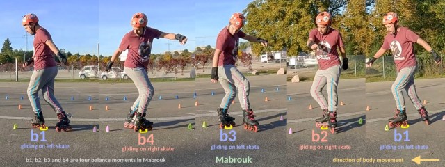 Contrast the pure skating above to key moments of Mabrouk shown below. In the below filmstrip, I have included balance moments b1 through b4, as defined in the falls/recoveries article, which serve as transition steps between symmetric distribution points. Note how no skate ever leaves the ground. Through Mabrouk, both skates are gliding skates. This is what “two-footed” means.