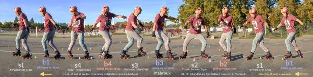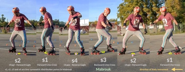 There are brief moments in Mabrouk where the two skates shoulder a skater’s body weight equally in the middle of a balance transition. At these points, legs and skates form symmetric shapes, with a cone marking the center of symmetry. I called these “symmetric distribution points”. At a symmetric distribution point, the projected center of gravity is at, or near a cone that the skater maneuvers around. These points can be used to name the four components of Mabrouk, because these symmetric stances are hallmark postures of Mabrouk. From the right to the left as shown below, these components are: forward criss-cross (s1), chapi – forward eagle (s2), backward criss-cross (s3), and chapo – reverse eagle (s4).