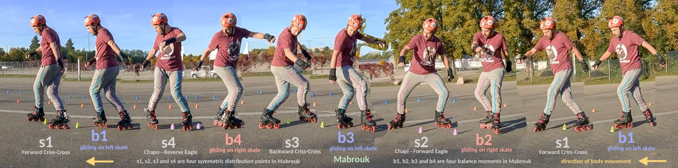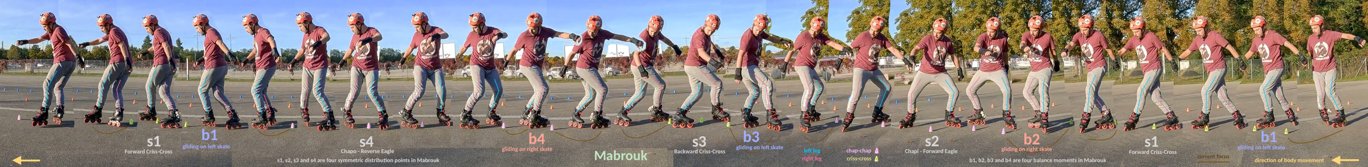 Similarly, the filmstrip above illustrates a full Mabrouk sequence, incorporating both slalom components s1, s2, s3 and s4, and balance moments b1, b2, b3 and b4. Remember to read them from right to left, as indicated by the yellow arrow showing the direction of body movement. At every component and moment, the projected center of gravity is indicated by a yellow circle on the ground. Slalom components are labeled in white – they are symmetric distribution points where both skates shoulder body weight equally. Balance moments are transition steps where one skate shoulders all body weight, colored blue when the left skate carries body weight and glides, and red when the right skate does so.
